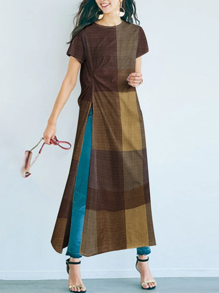 Plaid Split Twist Round Neck Short Sleeve Casual T-Shirt