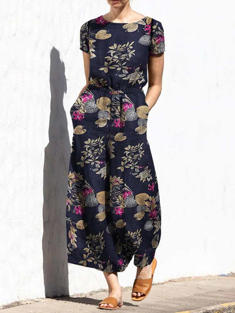 Plant Print Pocket Sash Round Neck Short Sleeve Cotton Jumpsuit