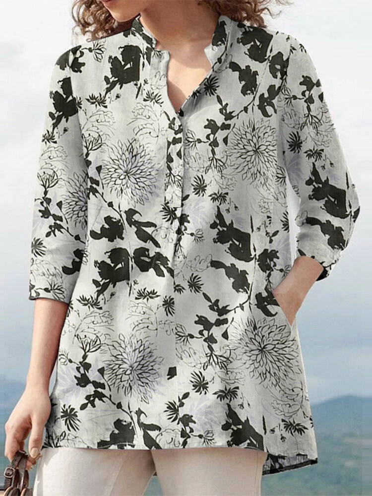 Plants Print Button Pocket Stand Collar 3/4 Sleeve Blouse