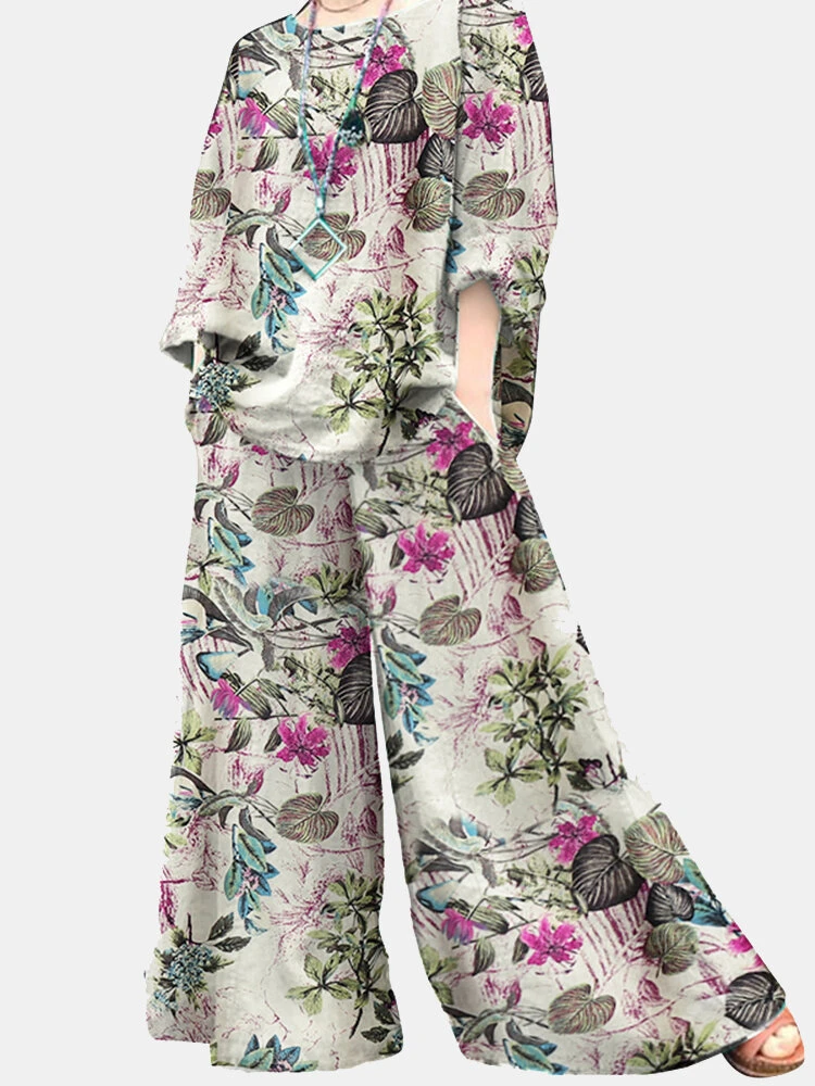 Plants Print Pocket Crew Neck Two Pieces Suit