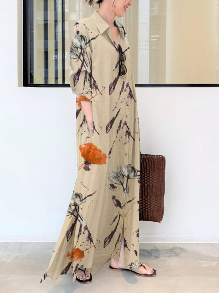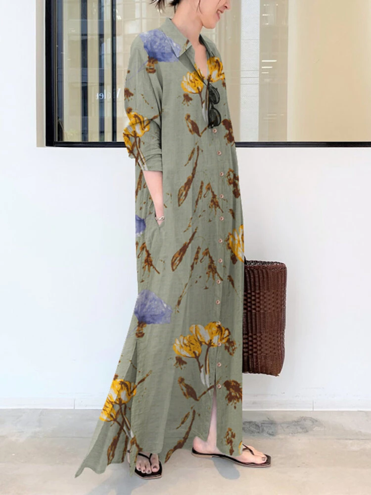 Plants Print Pocket Long Sleeve Button Maxi Shirt Dress