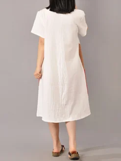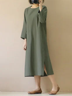 Vintge Split Hem Big Pockets Cotton Plus Size Solid Dress