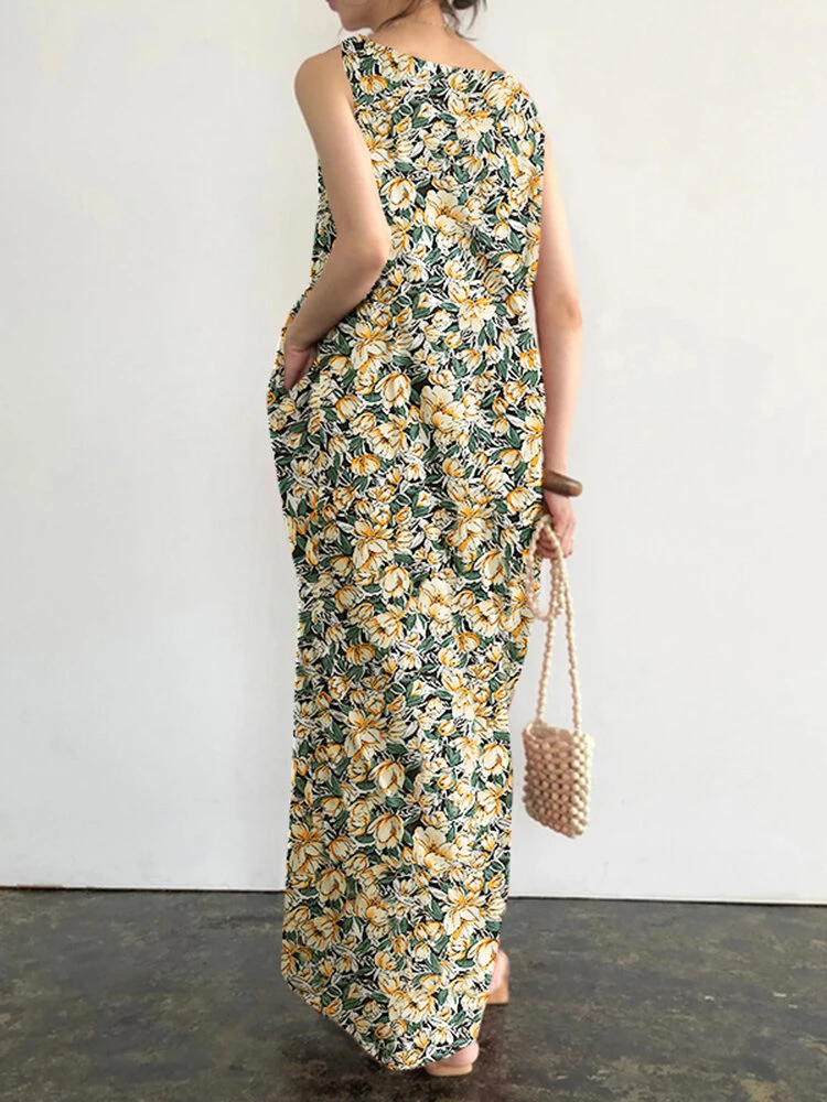 Pocket Floral Print Round Neck Sleeveless Maxi Dress