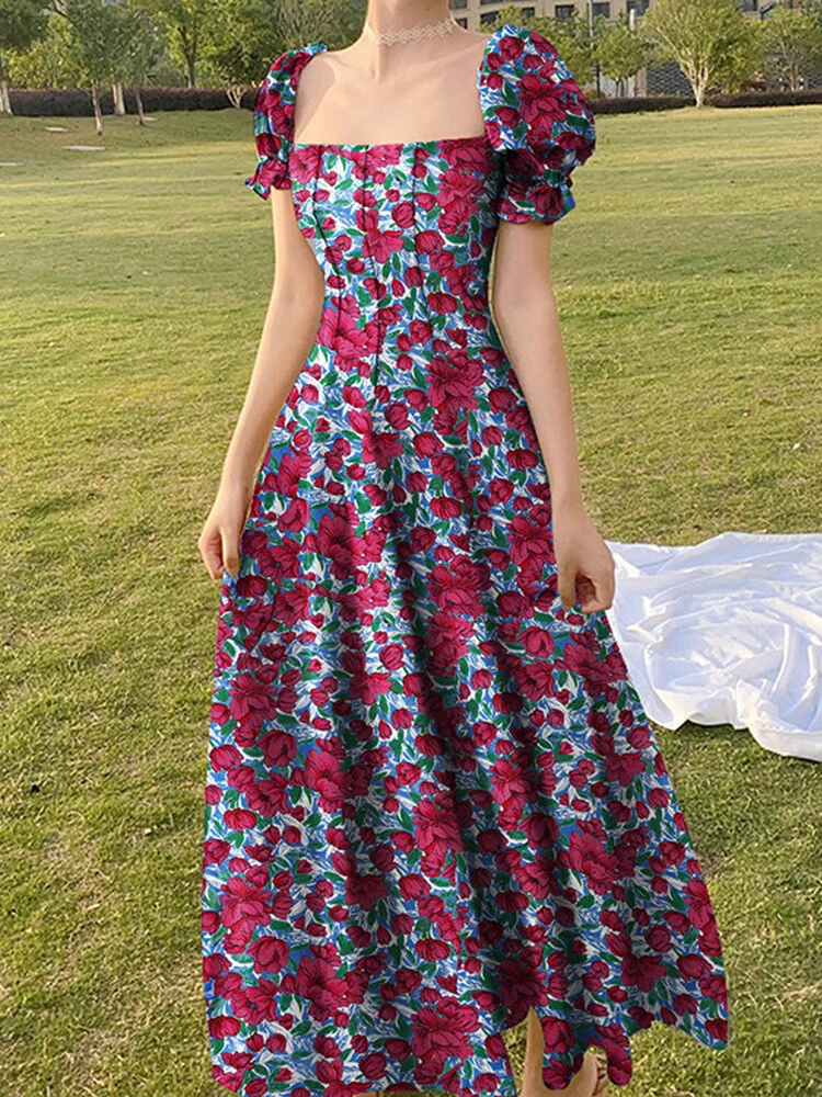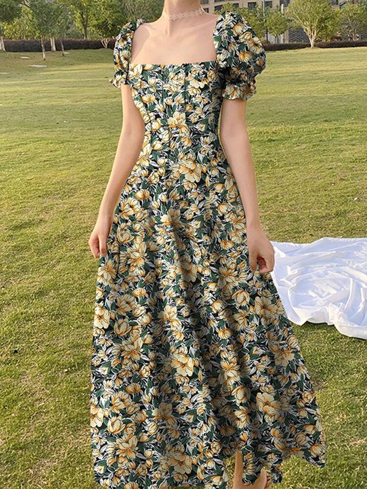 Random Allover Floral Print Puff Sleeve Square Collar Maxi Dress