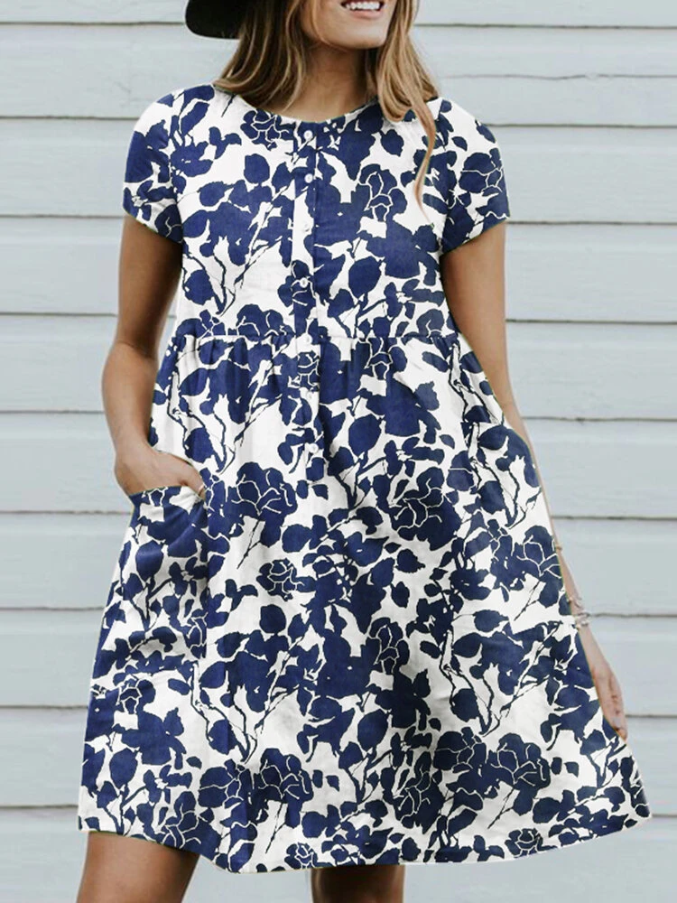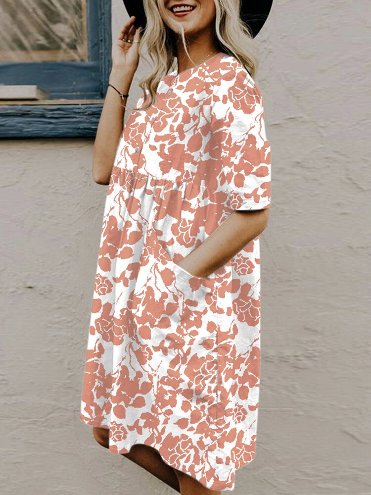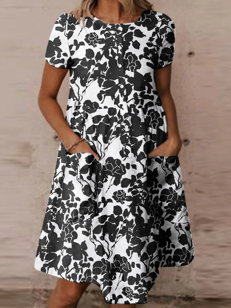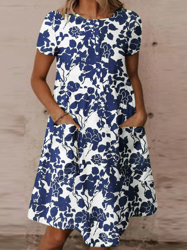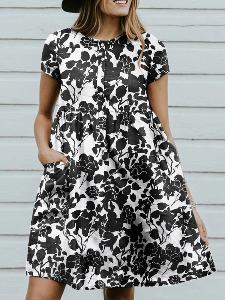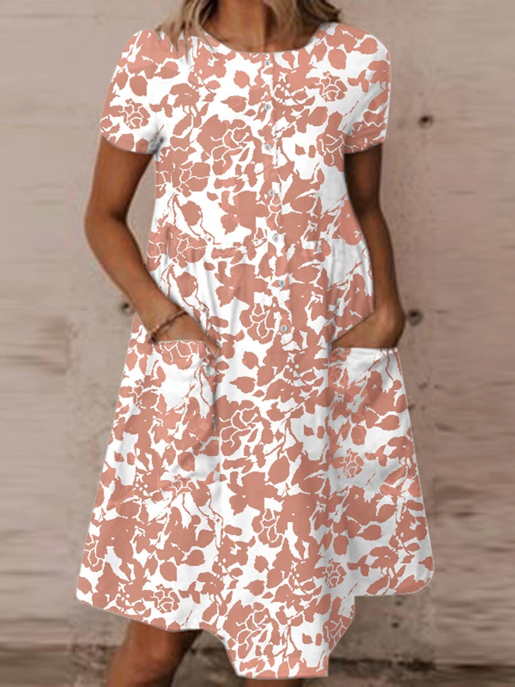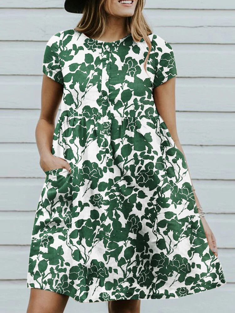 Random Allover Leaves Print Pocket Short Sleeve Button Dress