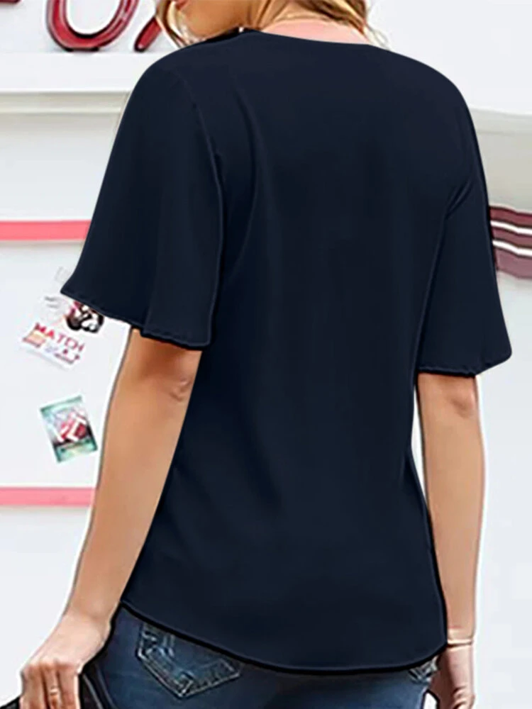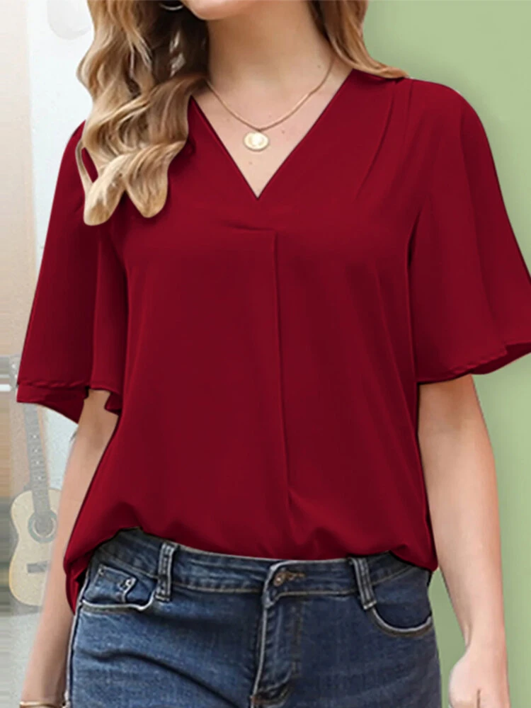 Color: Khaki, Wine Red, Pink, Navy Material: Polyester Pattern: Plain Occasion: Office chic Style: Casual Sleeves Length: Short Sleeve Sleeves Type: Ruffle Sleeves Collar: V-neck Season: Summer Package Included:1*Blouse