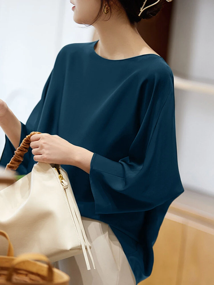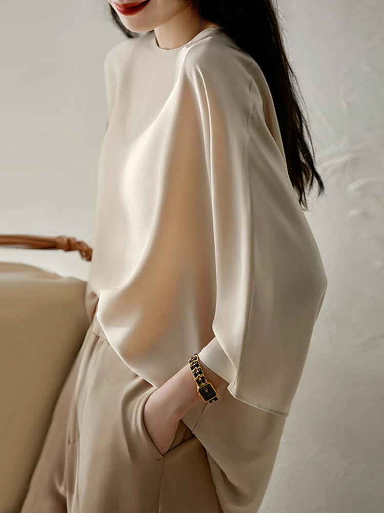 Satin Solid Dolman Sleeve Crew Neck Women Blouse
