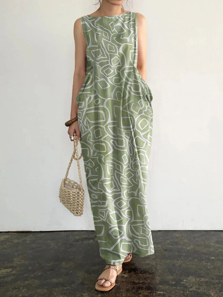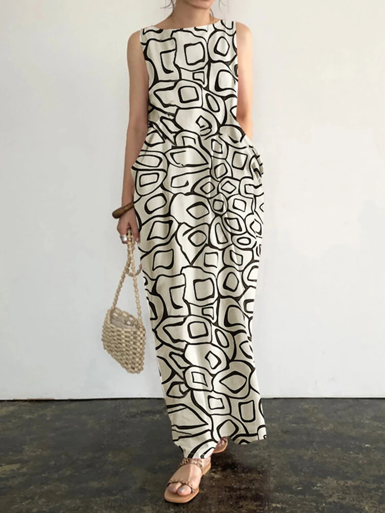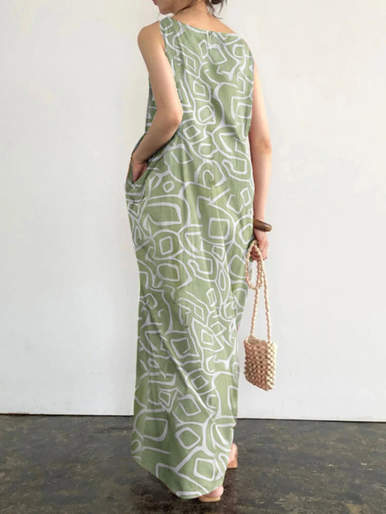 Sleeveless Round Neck Pocket Print Paisley Maxi Dress