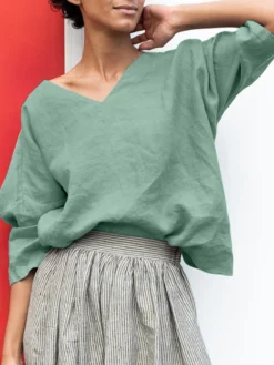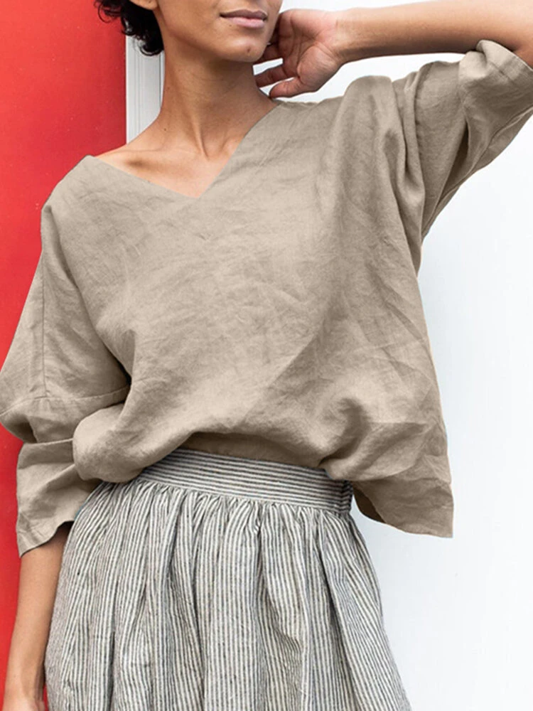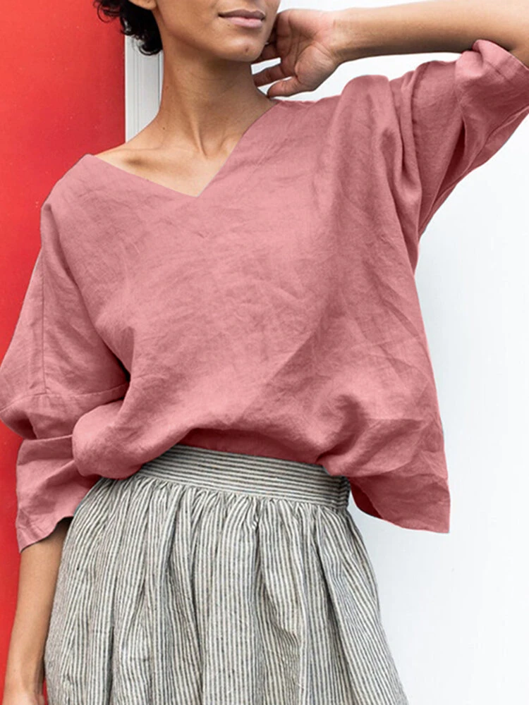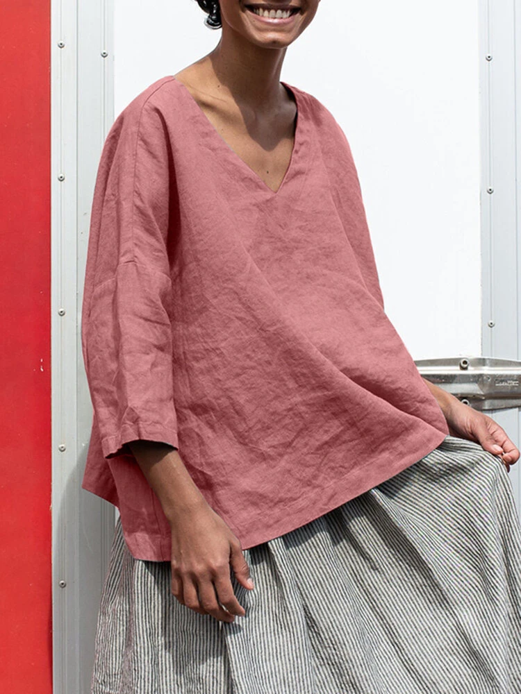 Color: Khaki, Pink, Navy, Green Material: Cotton, Linen Pattern: Plain Occasion: Everyday Style: Casual Sleeves Length: 3/4 Length Sleeve Collar: V-neck Fit Type: Loose Season: Autumn, Spring Package Included:1*Blouse