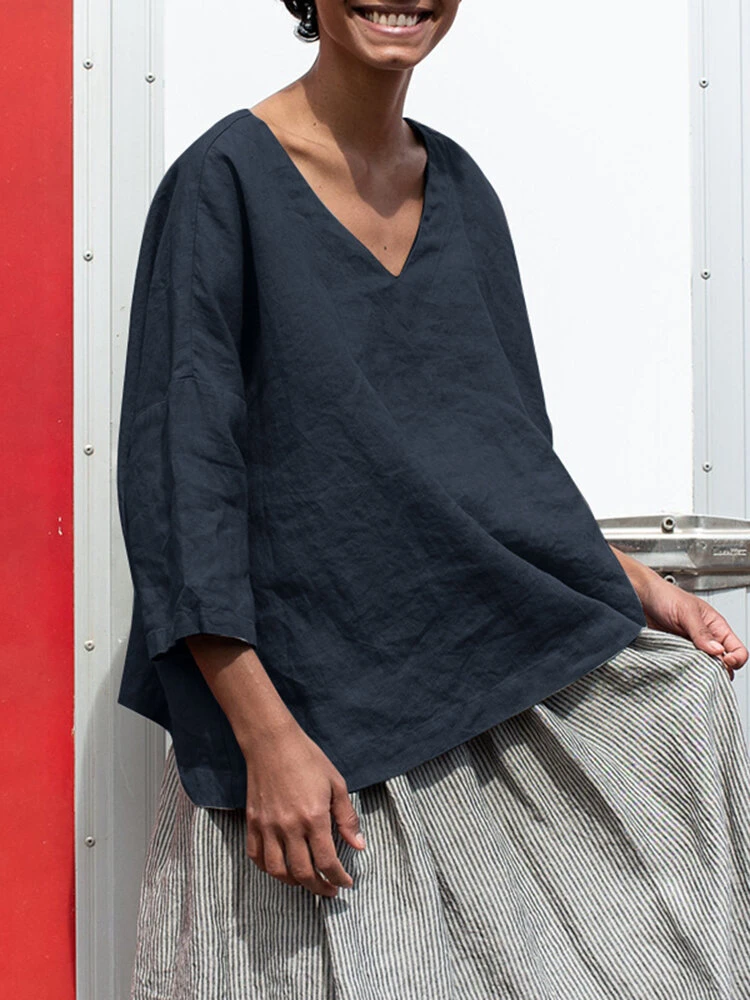 Solid 3/4 Sleeve V-neck Loose Blouse For Women