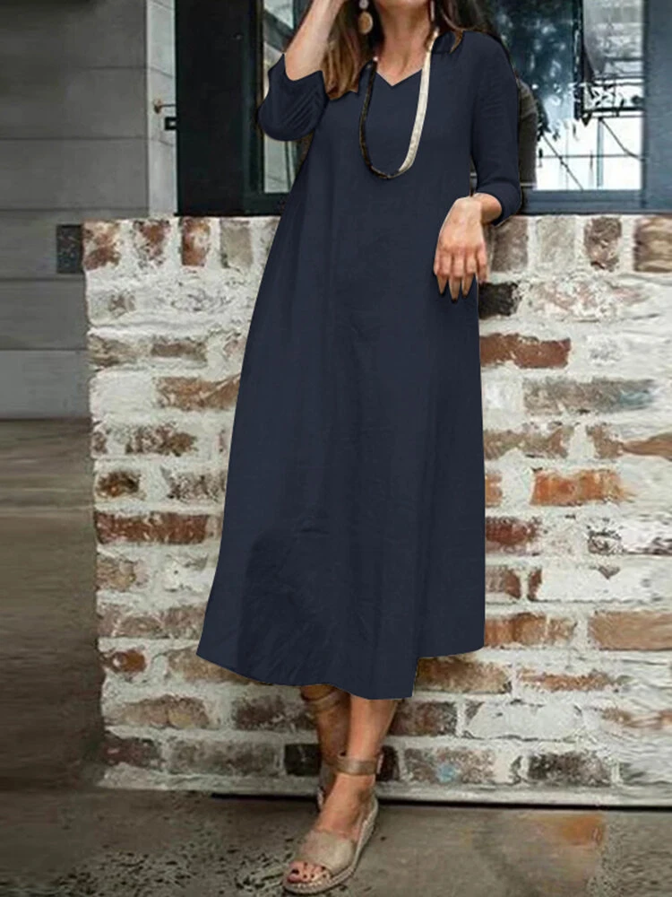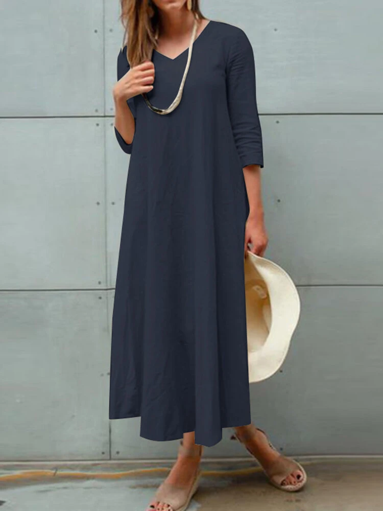 Solid 3/4 Sleeve V-neck Vintage Dress For Women