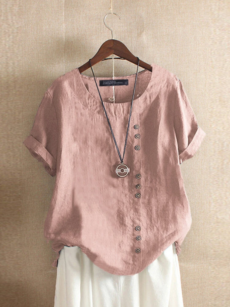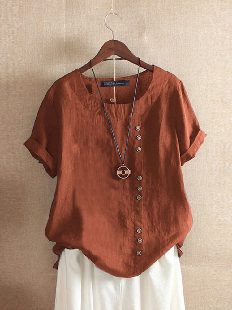 Color: Green, Navy, Orange, Pink, Beige Occasion: Everyday Material: Cotton, Linen Pattern: Plain Style: Casual Sleeves Length: Short Sleeve Collar: Crew Neck Season: Summer Design Element: Button Front Package Included:1*T-shirt