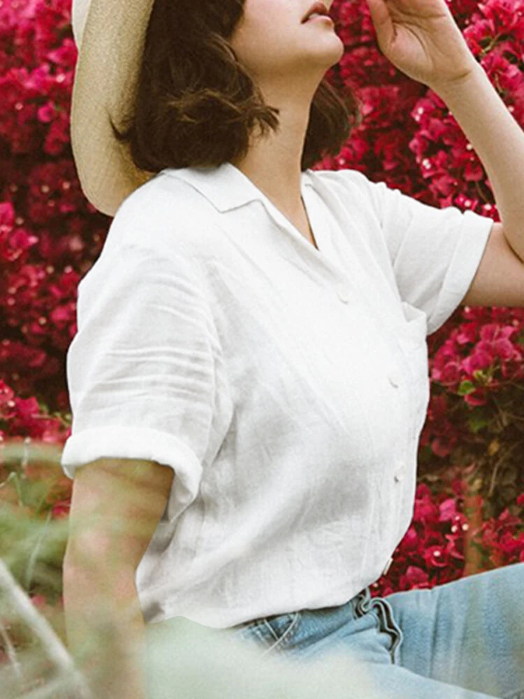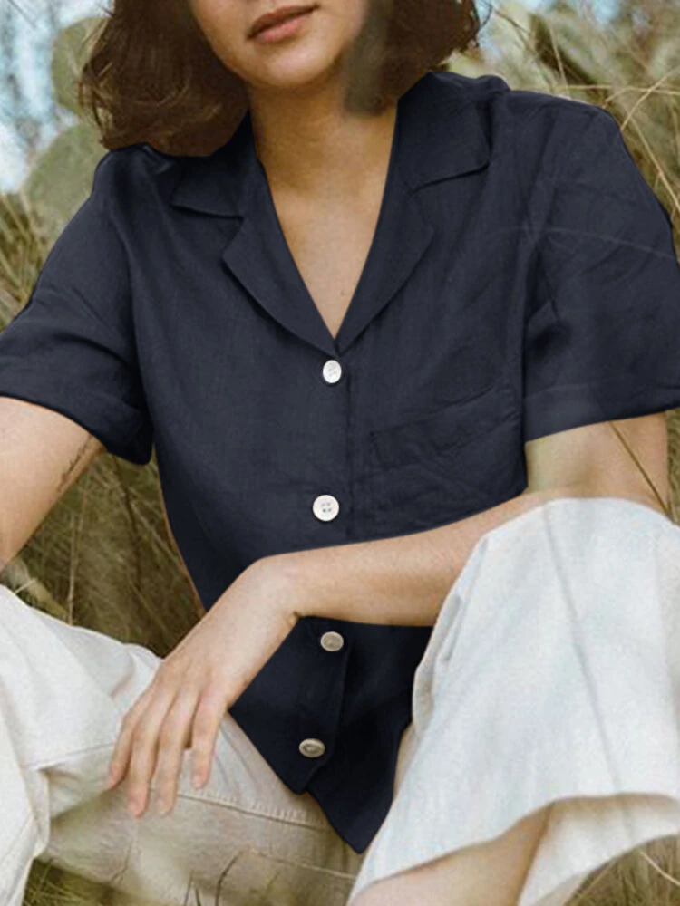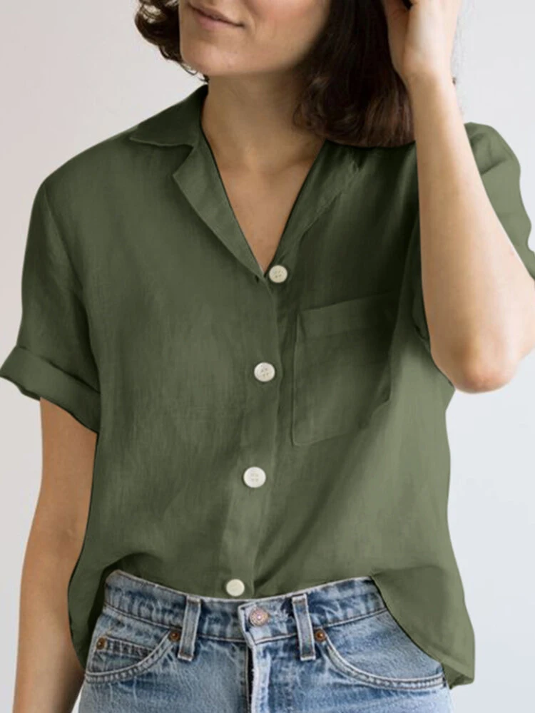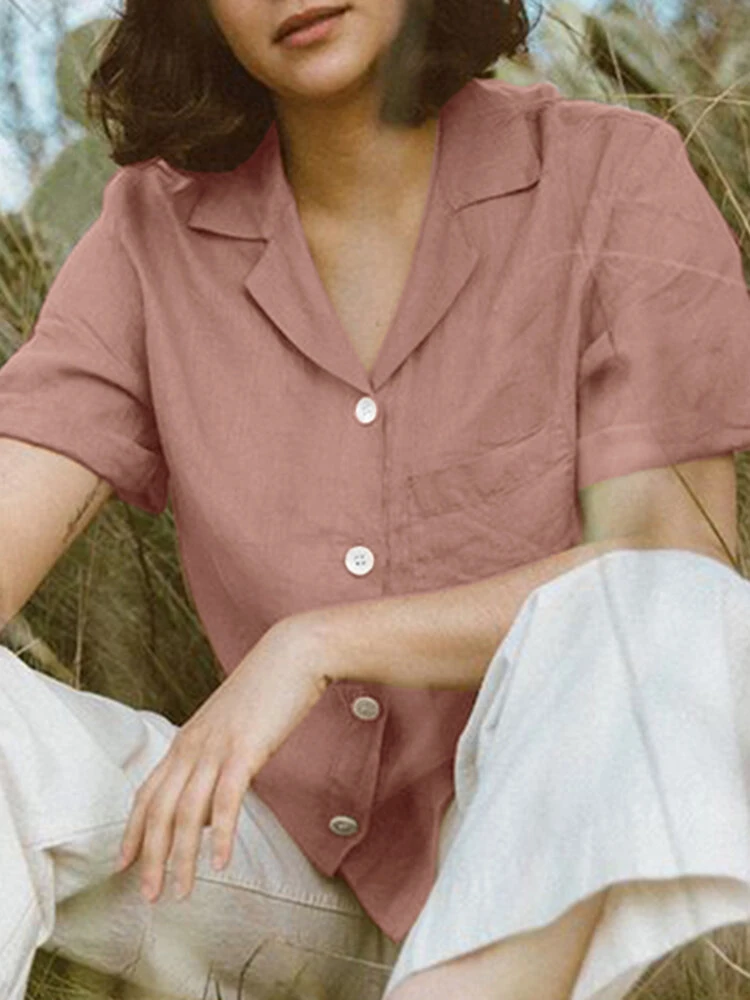 Color: White, Pink, Navy, Green Material: Cotton, Linen Pattern: Plain Occasion: Everyday Style: Casual Sleeves Length: Short Sleeve Collar: Lapel Collar Season: Summer Design Element: Pocket, Button Front Package Included:1*Shirt