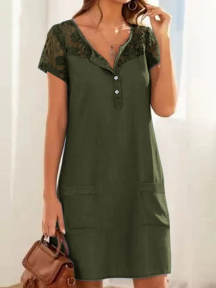 Solid Button Pocket Patchwork Hollow Out Short Sleeve Casual Dress