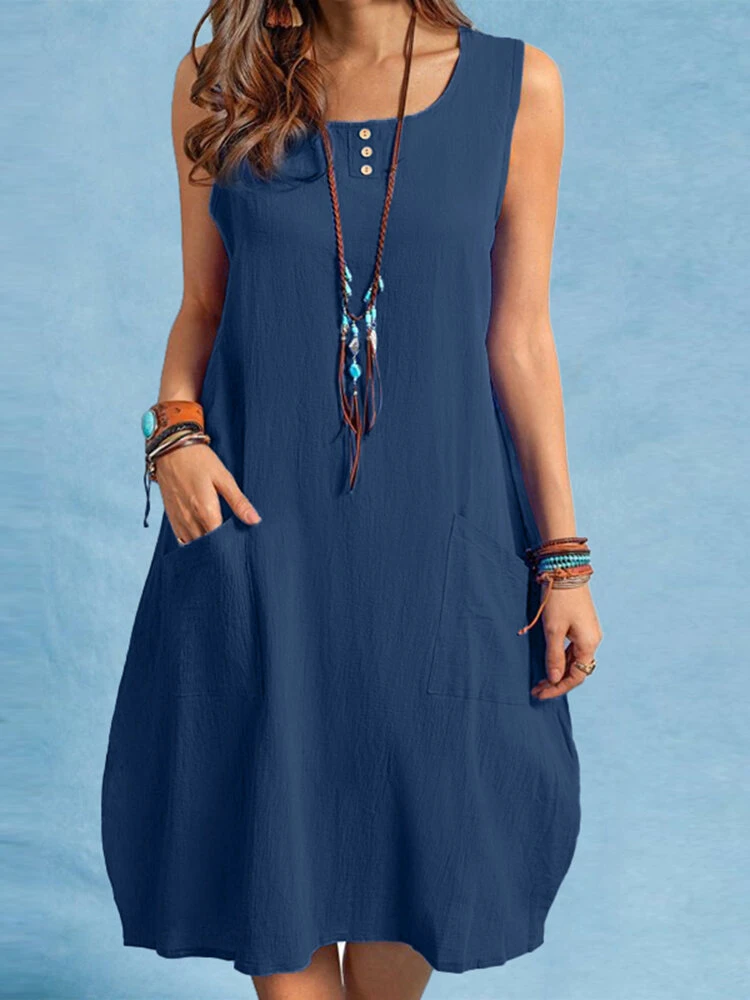 Solid Button Pocket Sleeveless Casual Cotton Midi Dress