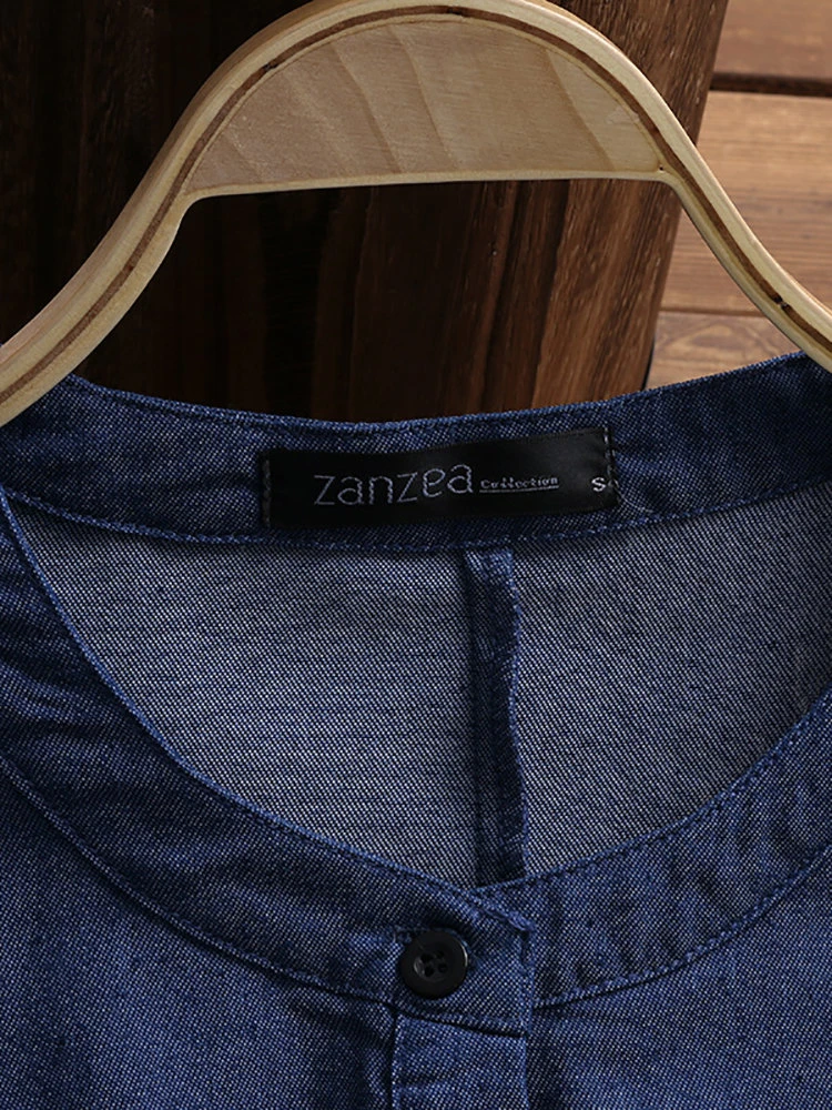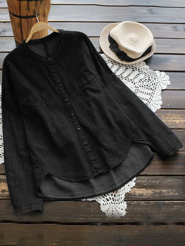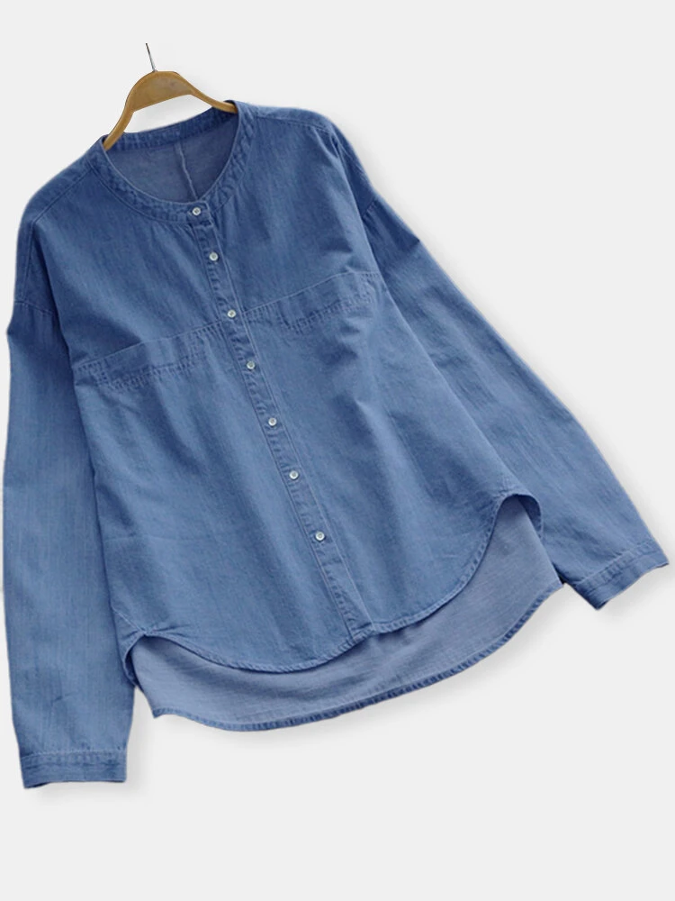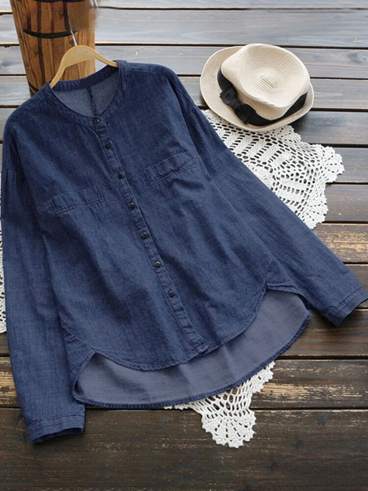 Solid Color Crew Neck Irregular Denim Plus Size Shirt