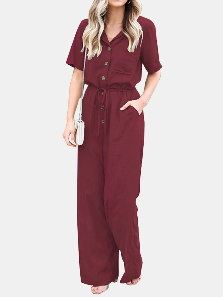 Solid Color Lapel Collar Button Short Sleeve Jumpsuit With Pocket