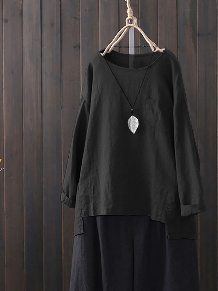Solid Color Long Sleeve High Low Vintage Plus Size Blouse