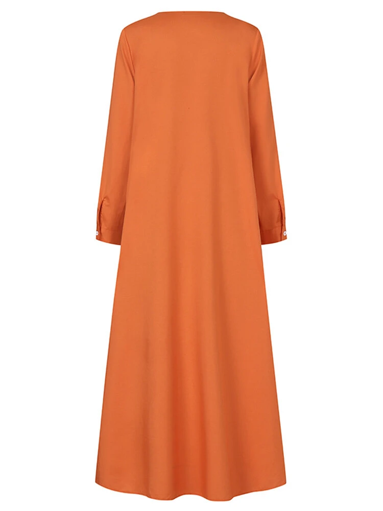 Solid Color O-neck Long Sleeve Plus Size Button Long Dress For Women