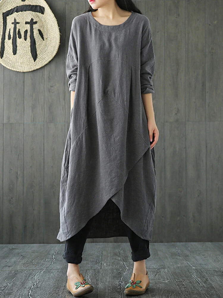 Solid Color O-neck Long Sleeves Asymmetrical Midi Hem Dress