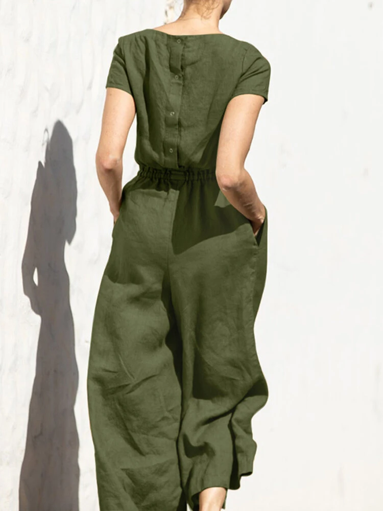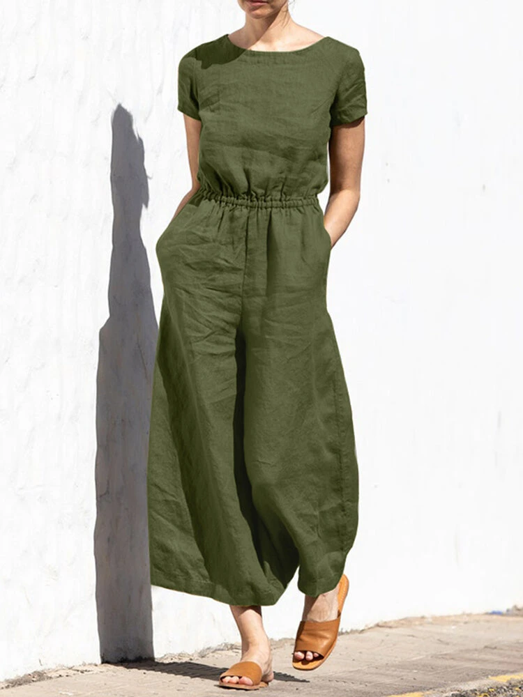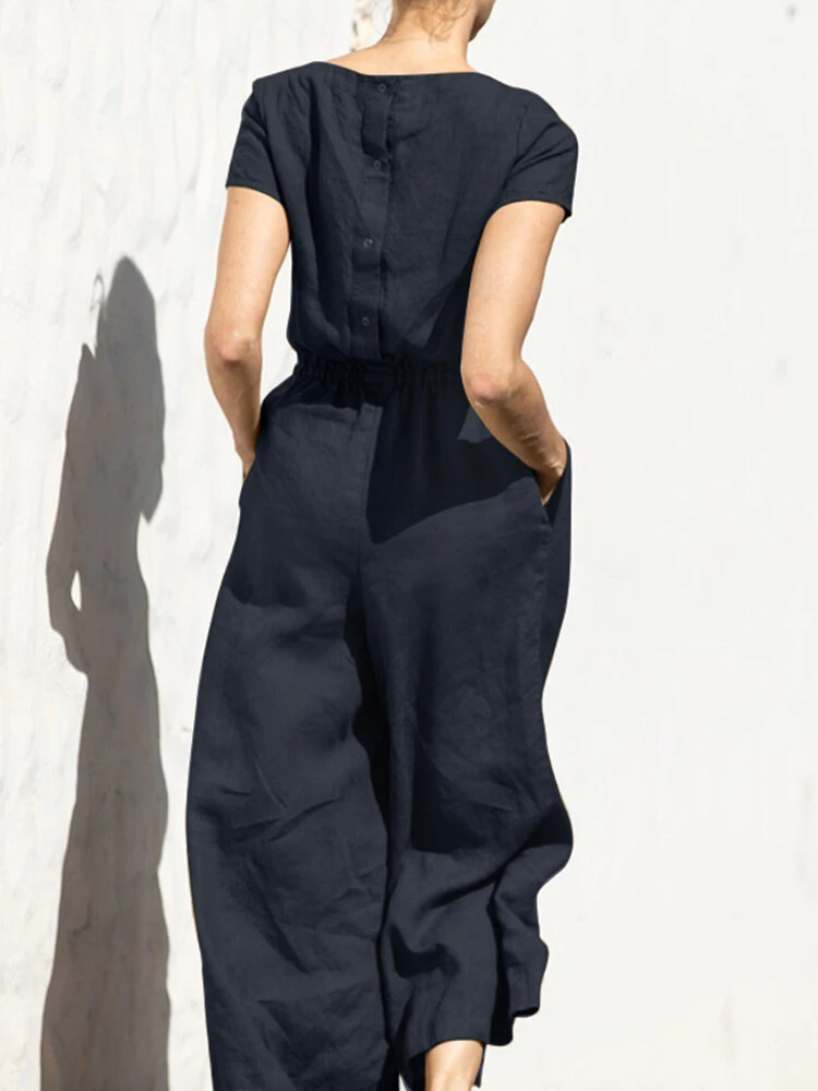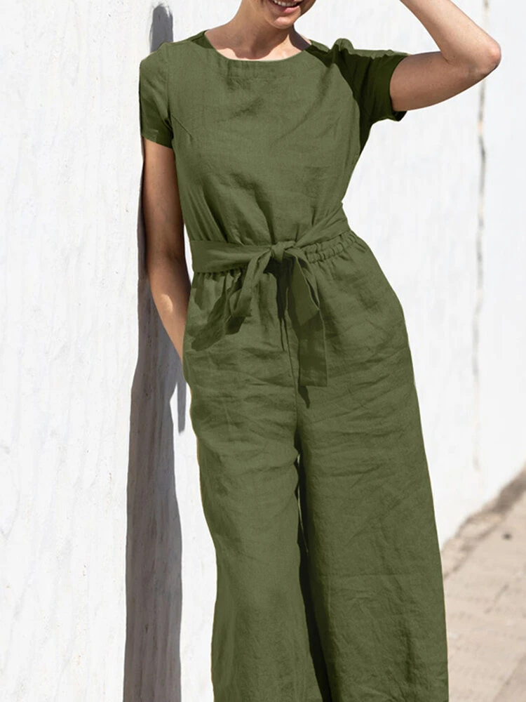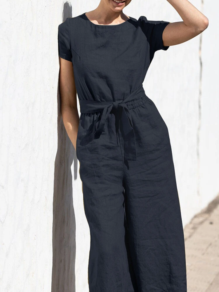 Solid Color Short Sleeve O-neck Cotton Wide Leg Jumpsuit