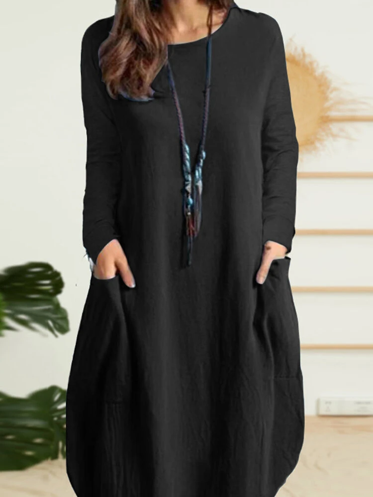 Solid Dual Pocket Long Sleeve Crew Neck Vintage Dress