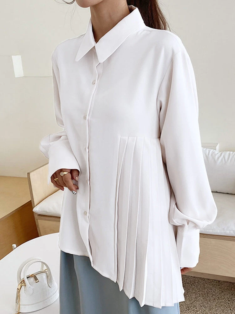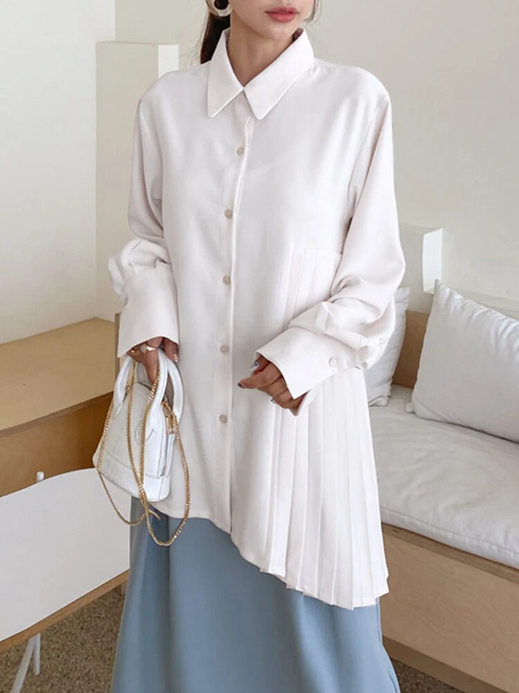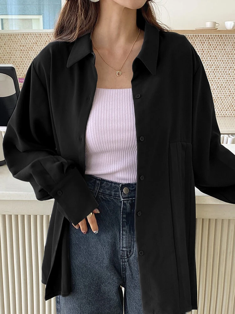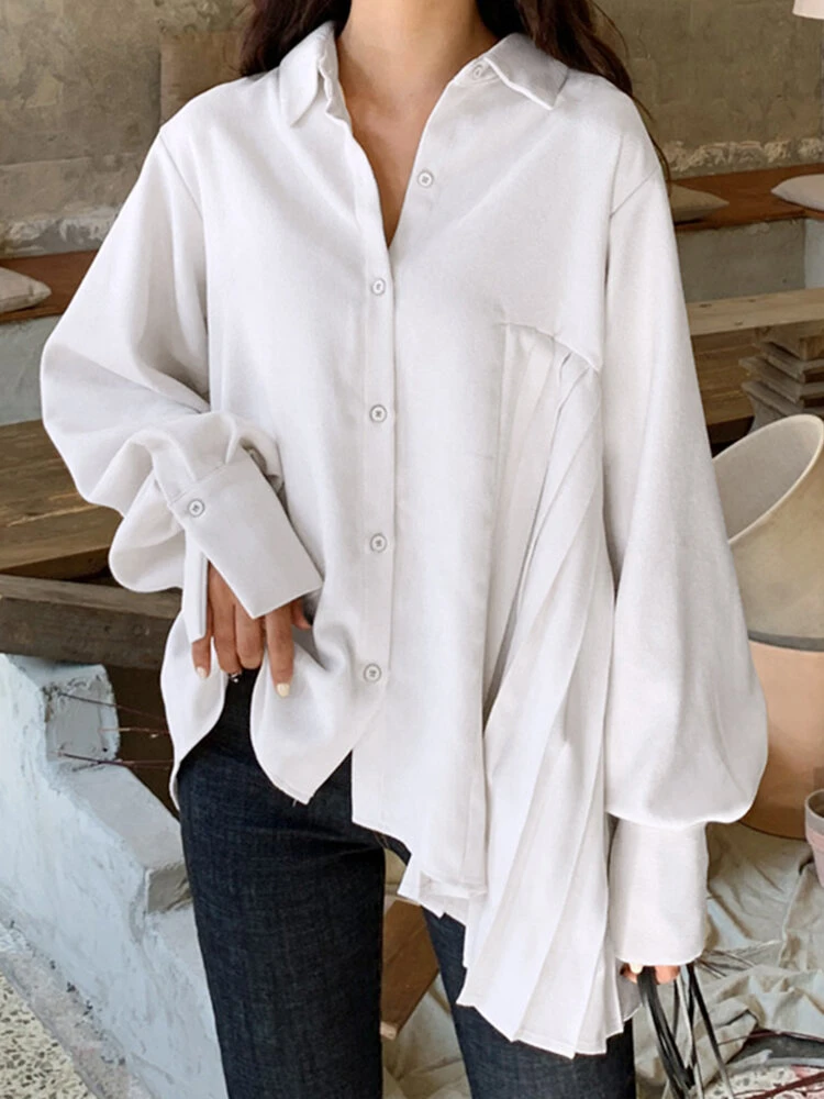 Solid Irregular Pleated Long Sleeve Lapel Button Down Shirt