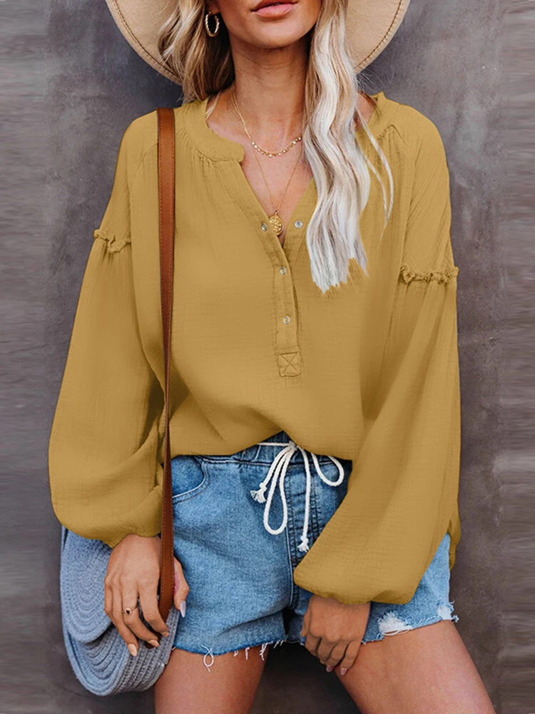 Solid Lantern Sleeve V-neck Casual Blouse For Women