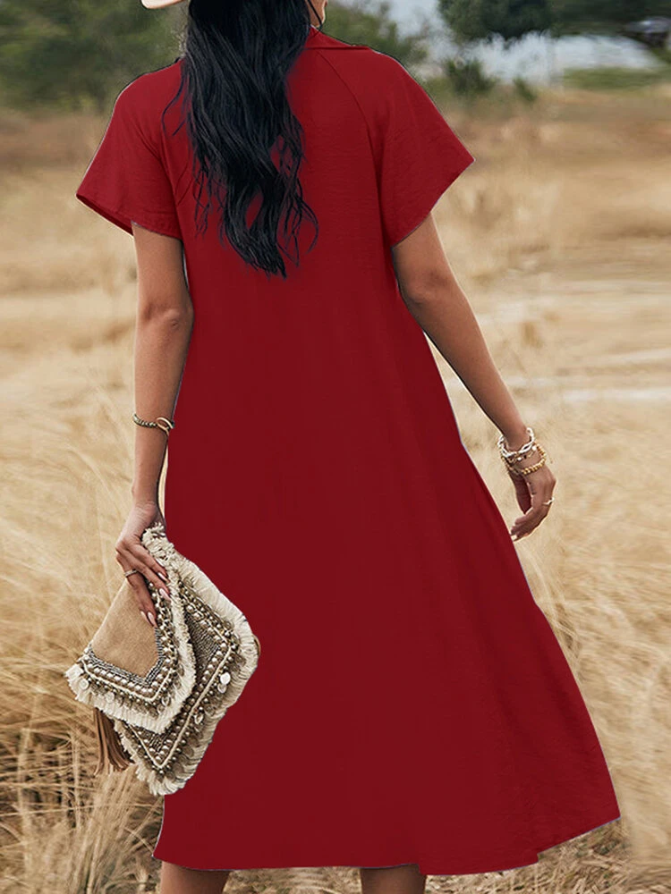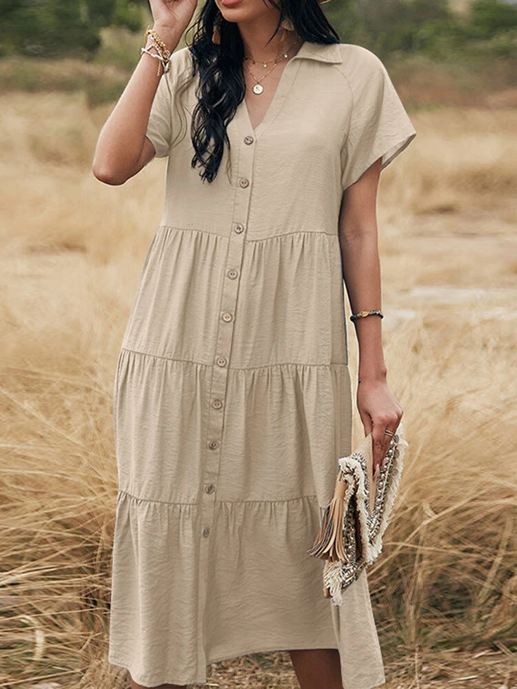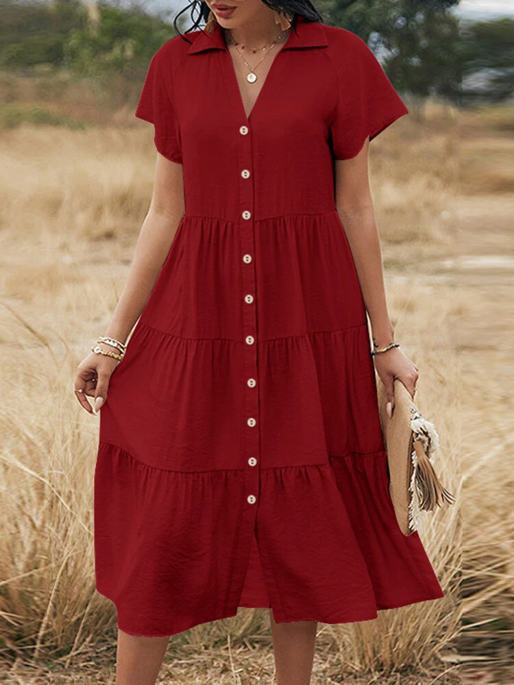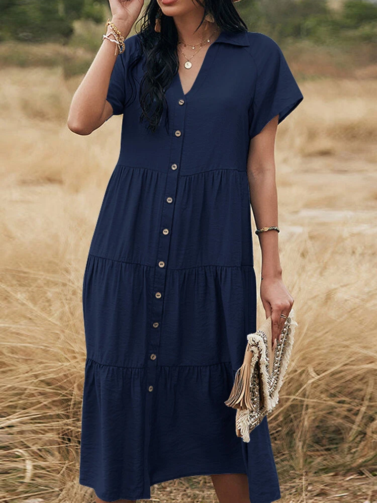 Solid Lapel Short Sleeve Button Front Casual Dress