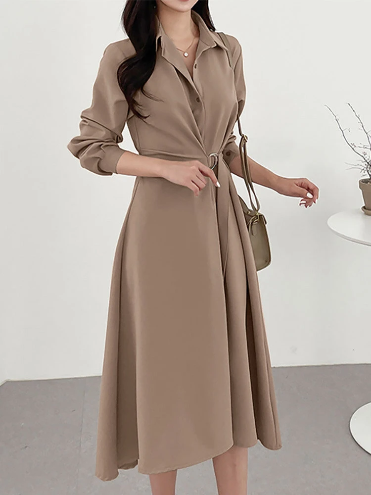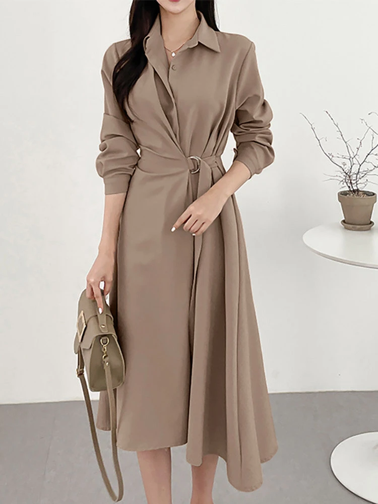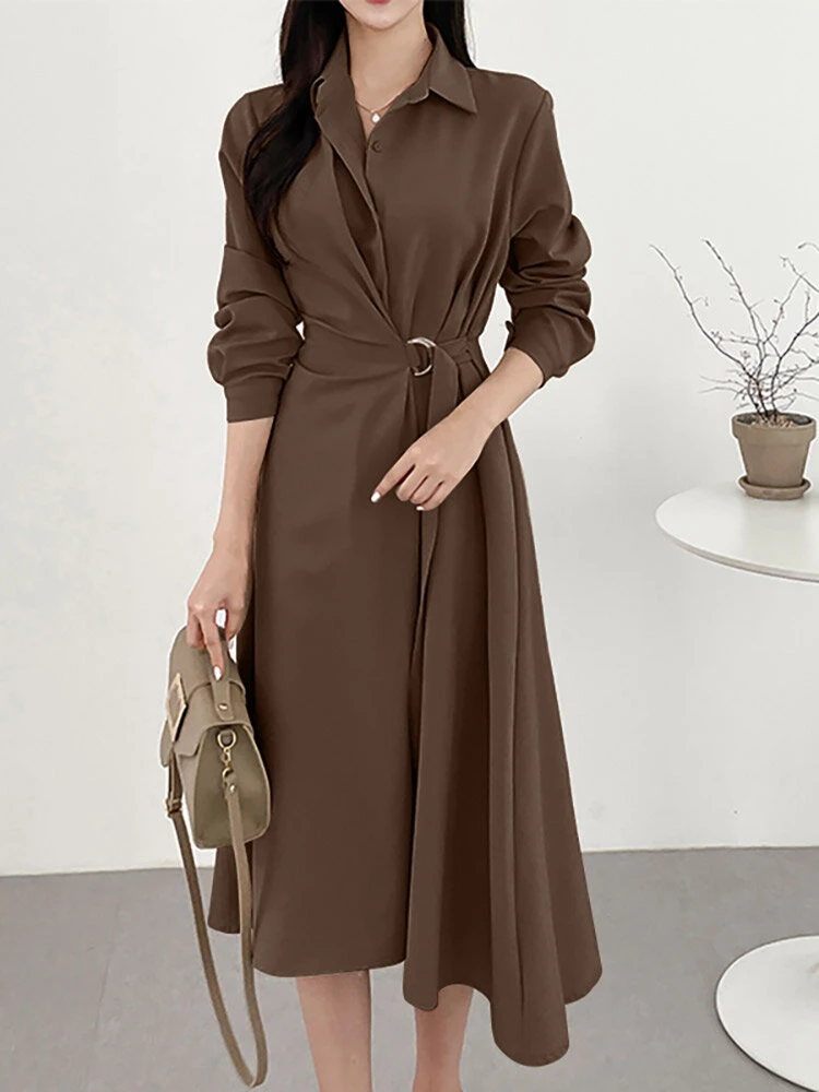 Solid Long Sleeve Belt Lapel Casual Dress