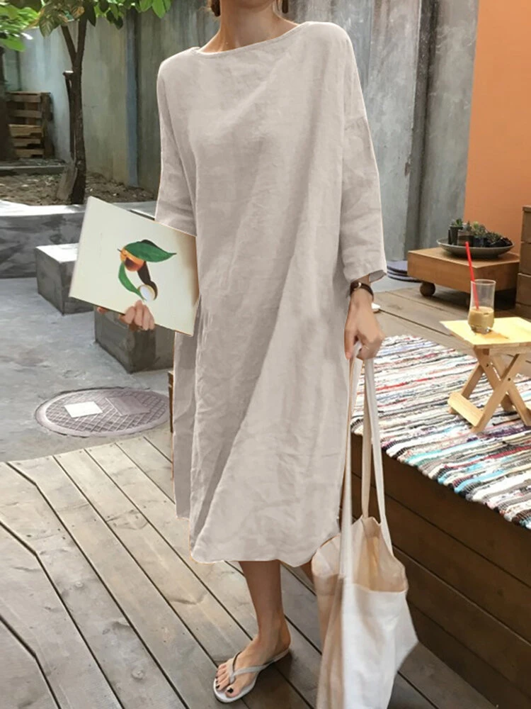 Solid Long Sleeve Loose Crew Neck Vintage Dress