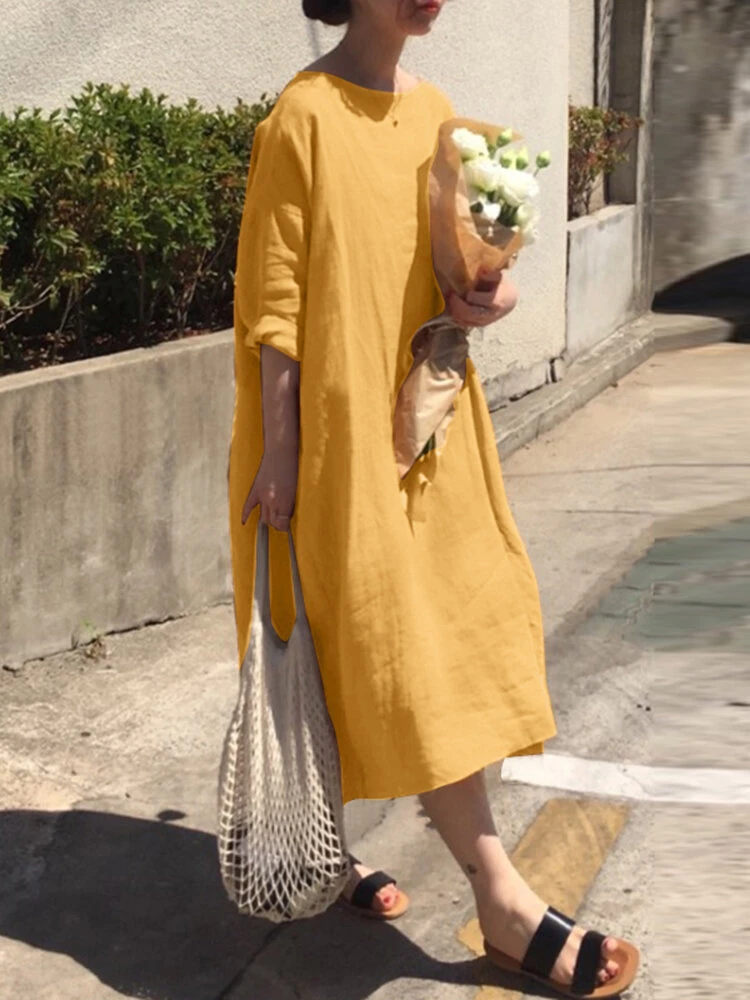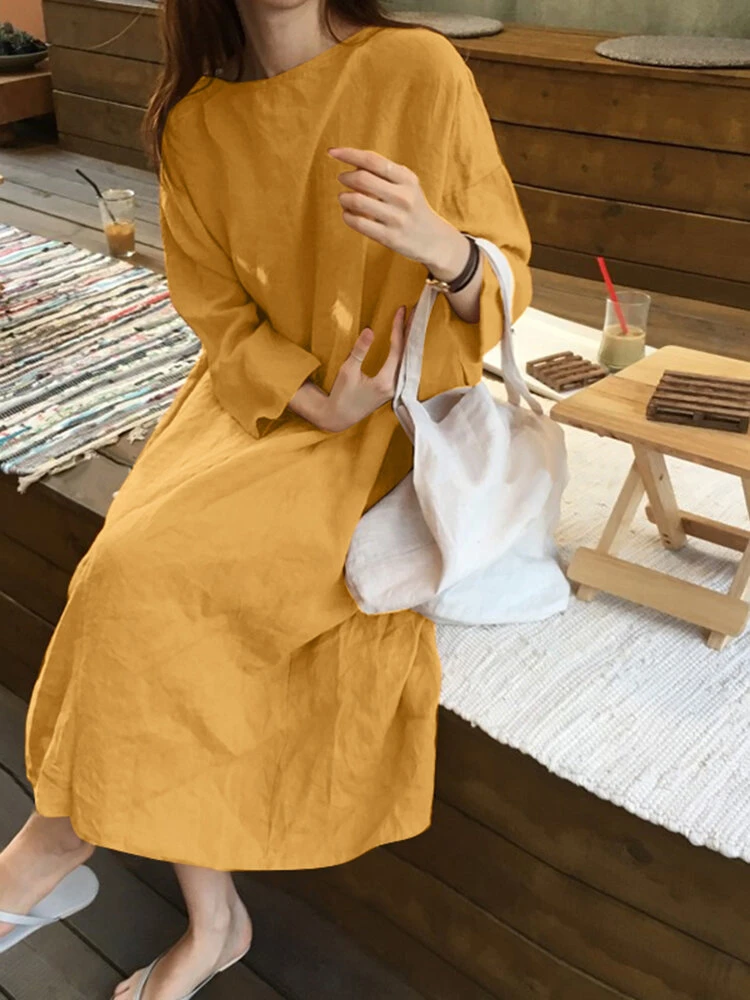 Color: Black, Apricot, Yellow Style: Casual Occasion: Everyday Material: Cotton, Linen Pattern: Plain Season: Spring, Autumn Collar: Crew Neck Sleeves Length: Long Sleeve Fit Type: Loose Package Included:1*Dress