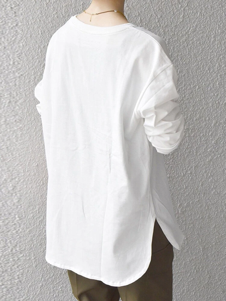 Color: Gray, White, Blue Occasion: Everyday Material: Polyester Pattern: Plain Style: Casual Sleeves Length: Long Sleeve Collar: Crew Neck Fit Type: Loose Season: Autumn, Spring Hem Design: Slit Hem Package Included:1*T-shirt