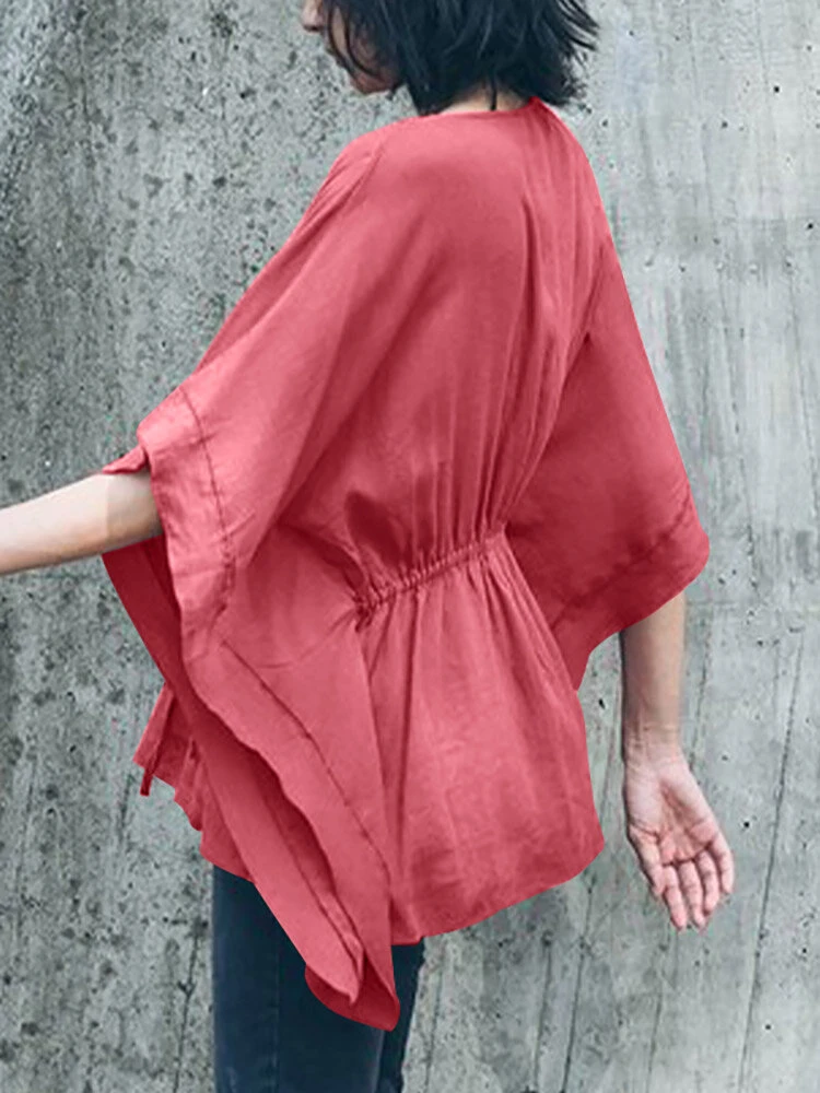 Solid Loose Drawstring Waist V-neck Dolman Sleeve Blouse