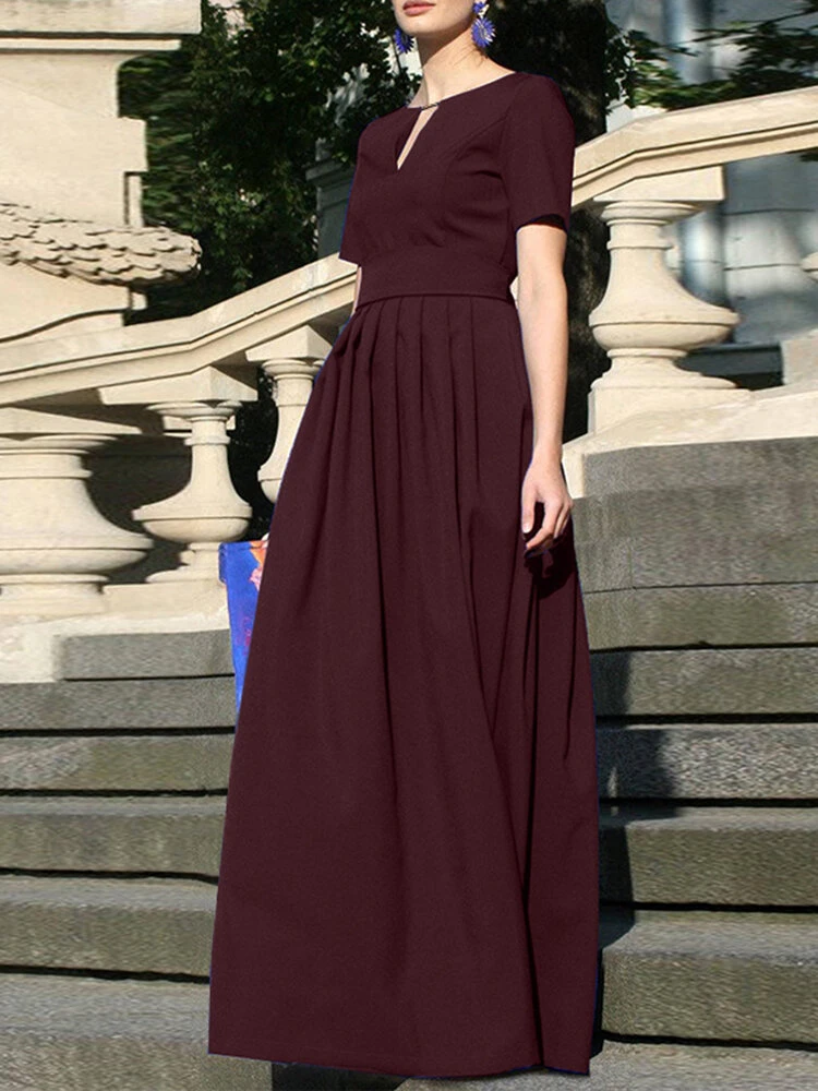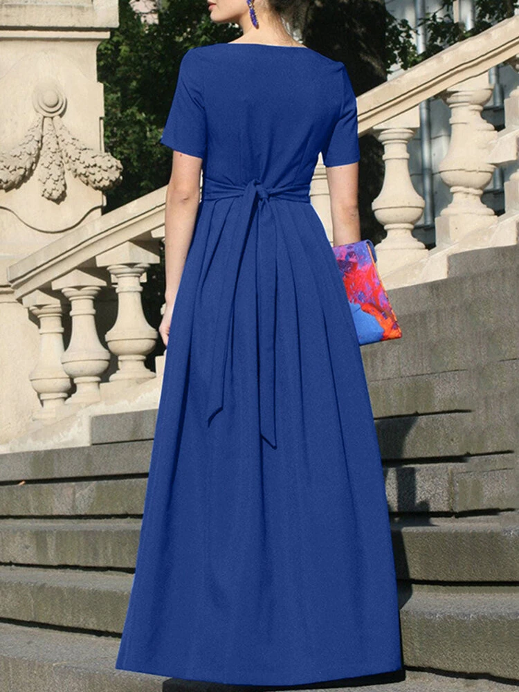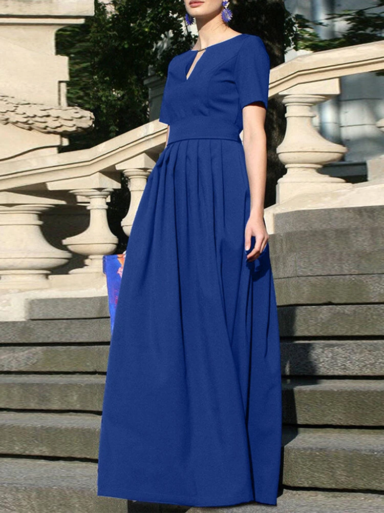 Solid Pleated Notch Neck Short Sleeve Maxi Dress With Belt