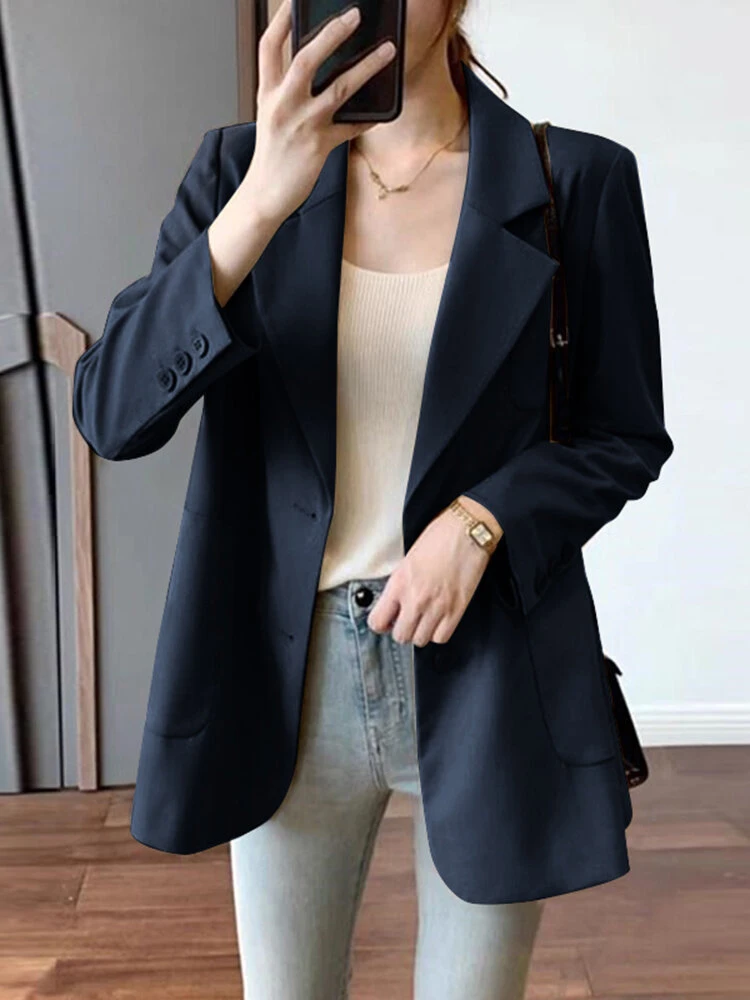 Solid Pocket Button Lapel Long Sleeve Blazer For Women