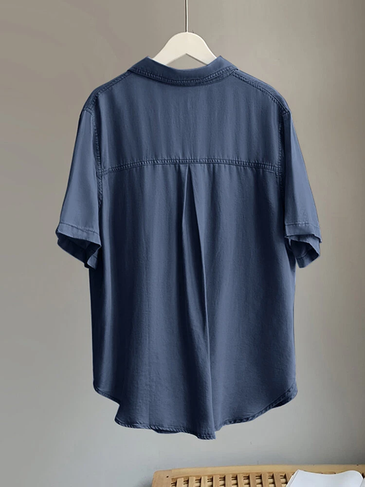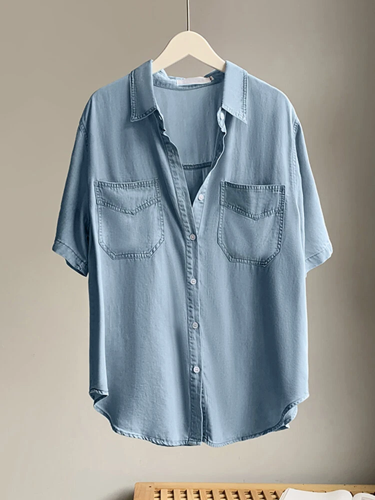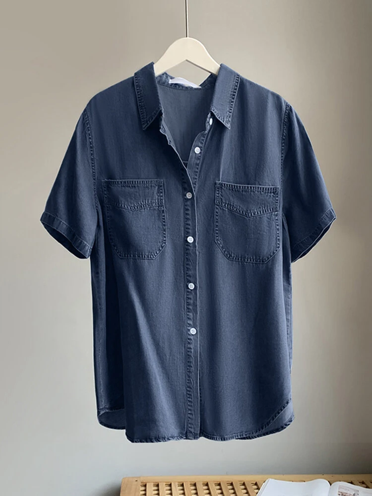 Solid Pocket Button Lapel Short Sleeve Loose Denim Shirt