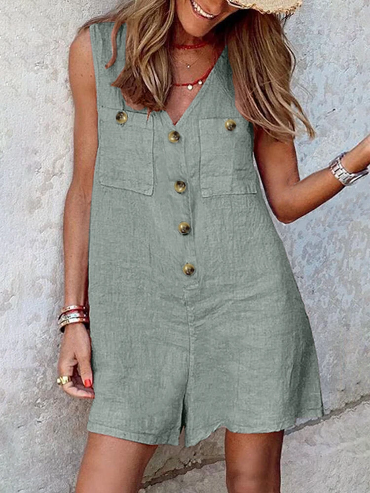 Solid Pocket Button Sleeveless V Neck Casual Romper