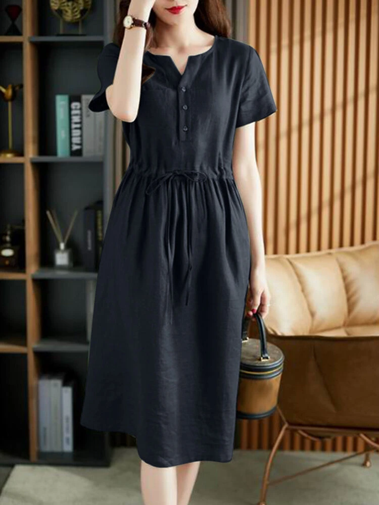 Color: Khaki, Wine red Style: Vintage Occasion: Everyday Material: Cotton, Linen Pattern: Plain Design Element: Drawstring, Pocket, Button Front Season: Summer Collar: V-neck Sleeves Length: Short Sleeve Package Included:1*Dress