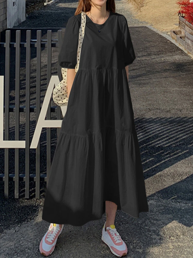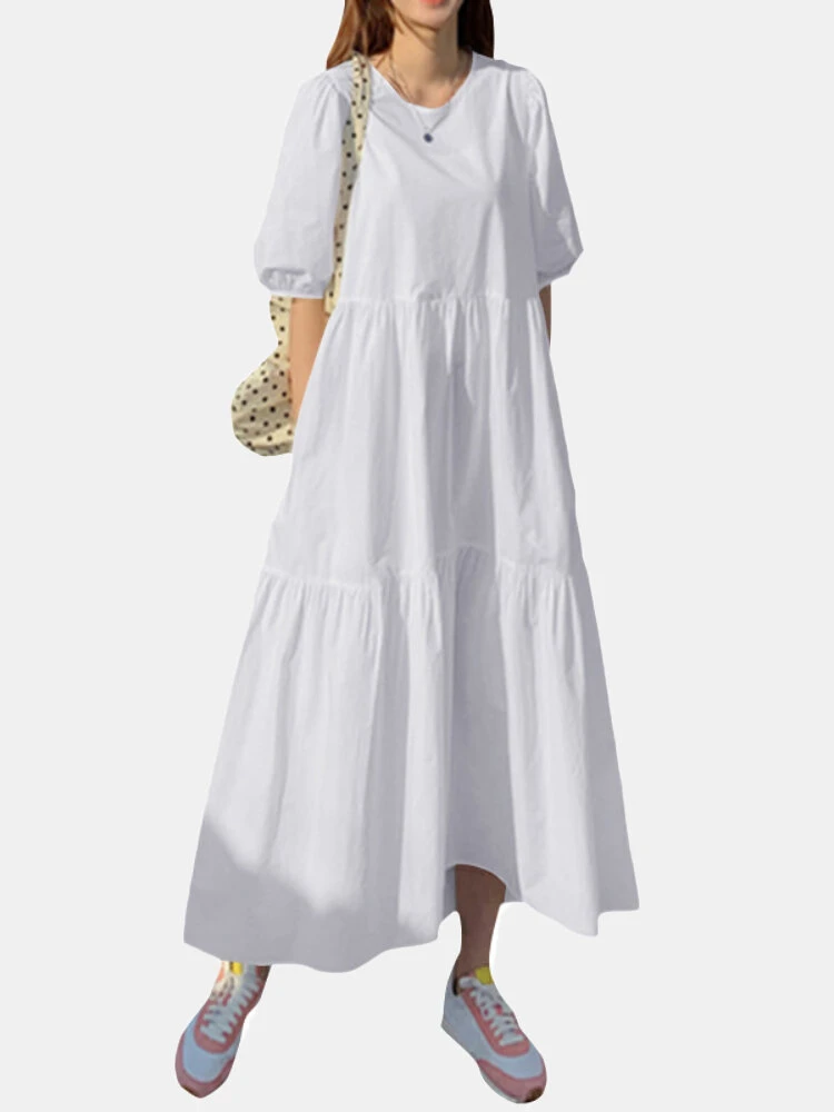Color: White, Black, Red Style: Casual Occasion: Everyday Material: Cotton Pattern: Plain Design Element: Pocket Season: Summer Collar: Crew Neck Hem Design: Ruffle hem Sleeves Length: Half Sleeve Sleeves Type: Puff Sleeves Length: Maxi Fit Type: Regular Package Included:1*Dress