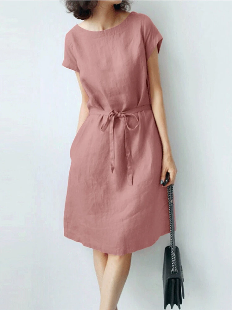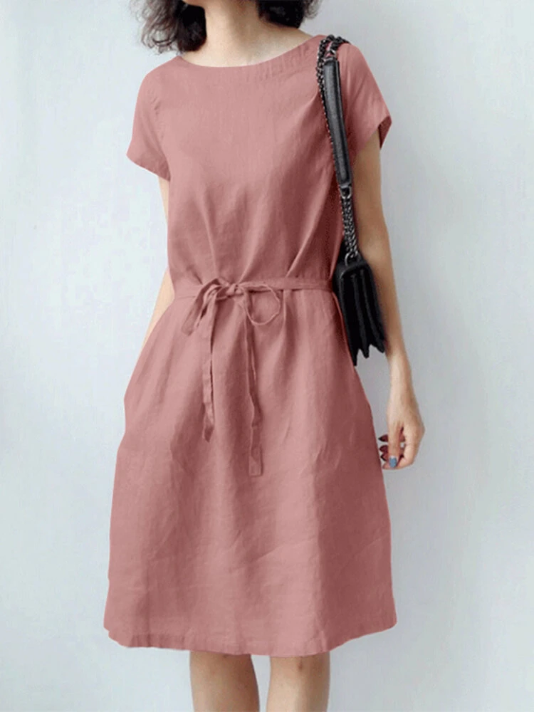 Color: Green, Yellow, Pink Style: Casual Occasion: Office chic Material: Cotton, Linen Pattern: Plain Design Element: Pocket Season: Summer Collar: Crew Neck Sleeves Length: Short Sleeve Package Included:1*Dress