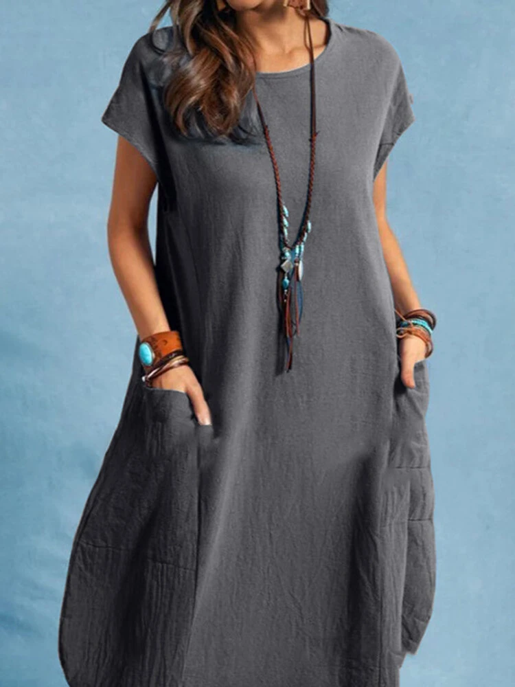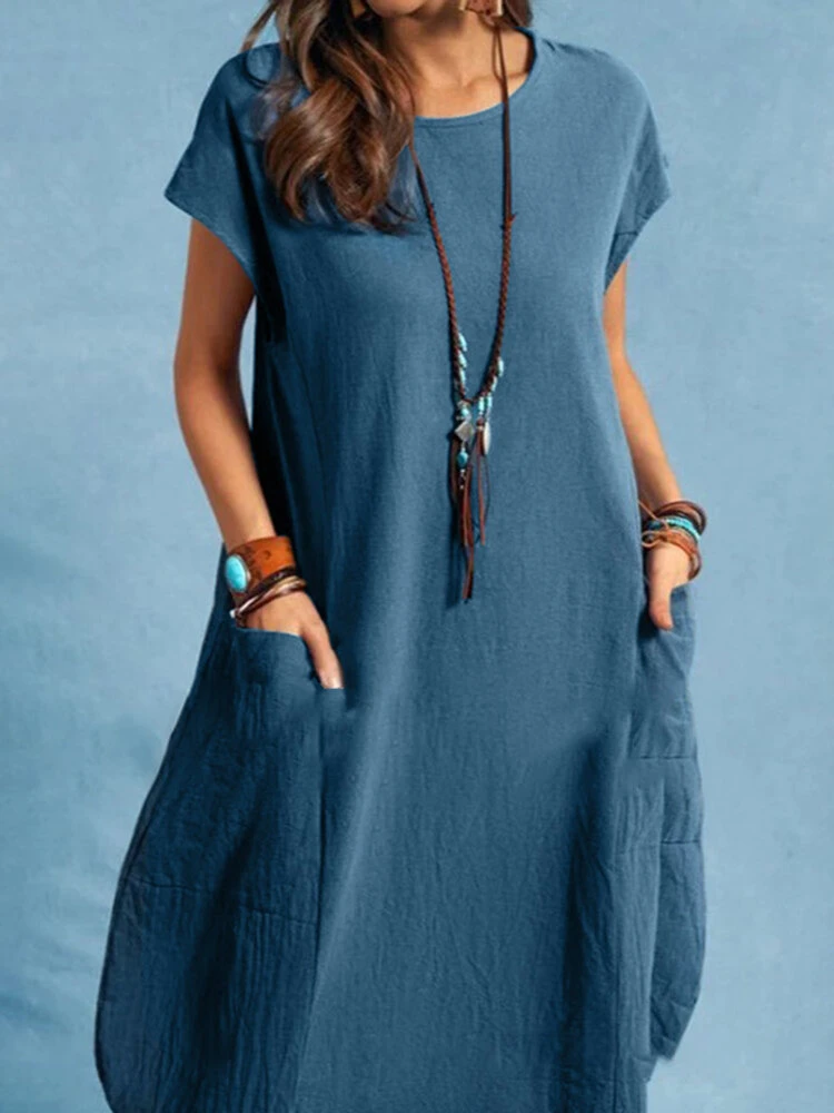 Solid Pocket Short Sleeve Round Neck Cotton Casual Dress