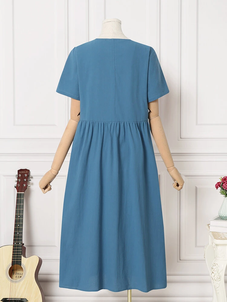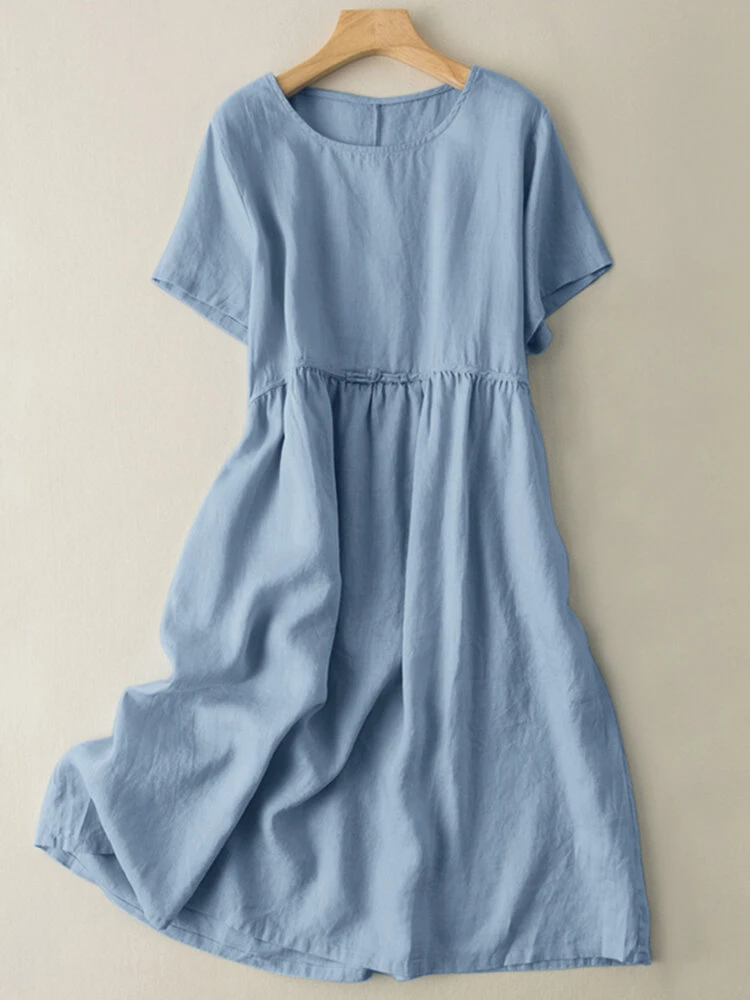 Color: Blue Style: Casual Occasion: Everyday Material: Cotton Pattern: Plain Season: Summer Collar: Crew Neck Sleeves Length: Short Sleeve Length: Midi Fit Type: Regular Package included:1*Dress