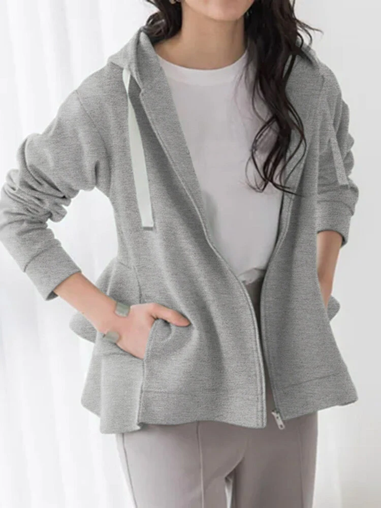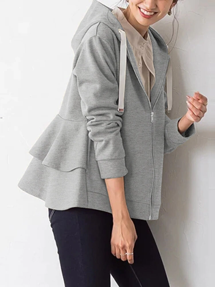 Solid Ruffle Hem Back Zip Pocket Drawstring Hooded Jacket