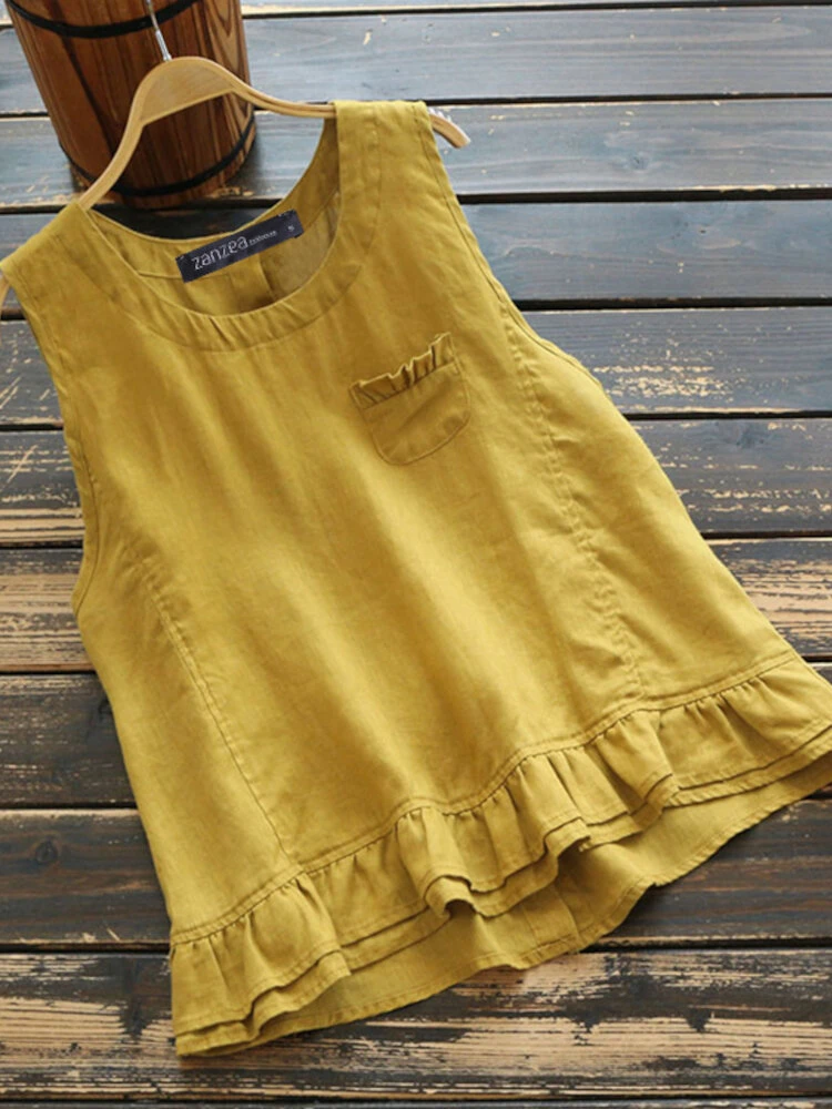 Solid Ruffle Hem Pocket Crew Neck Tank Top