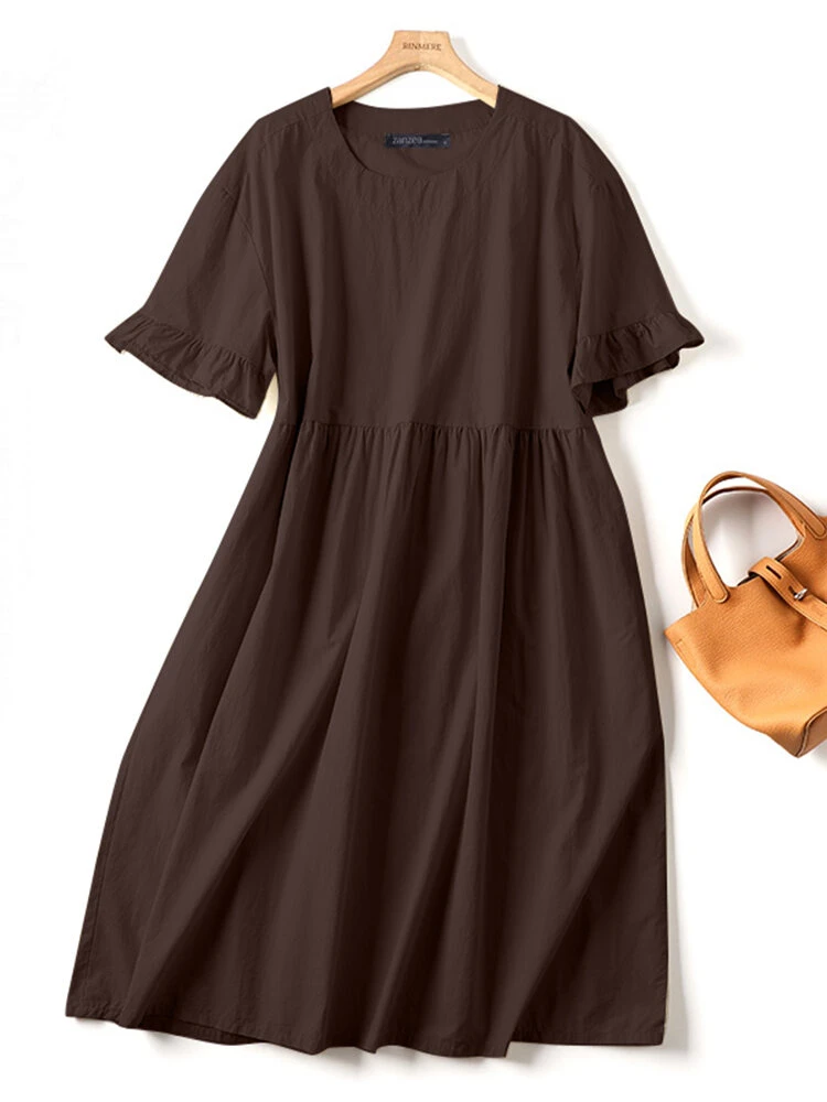 Solid Ruffle Short Sleeve Pocket Crew Neck Casual Dress
