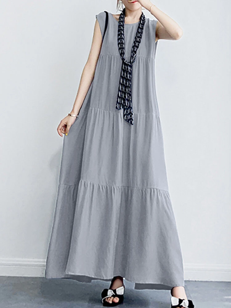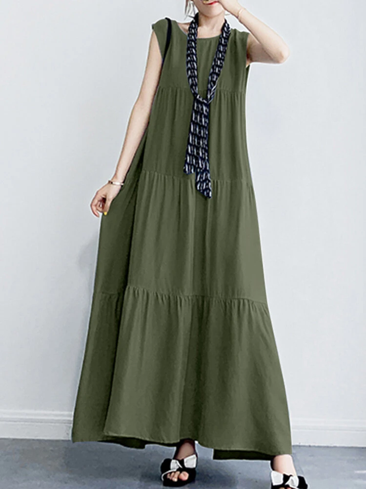 Solid Ruffle Sleeveless Vacation Casual Maxi Dress