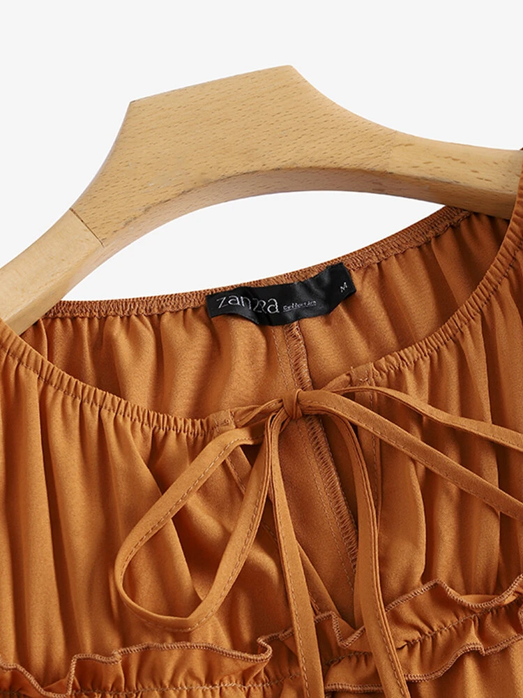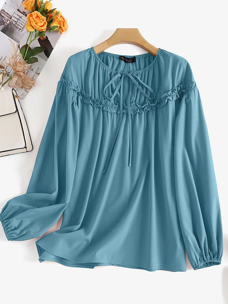 Be the first to review “Solid Ruffle Trim Tie Front Long Sleeve Crew Neck Blouse” Cancel reply