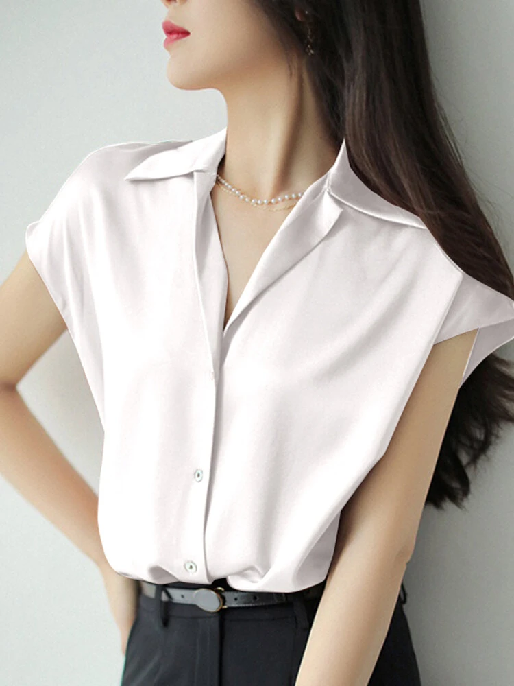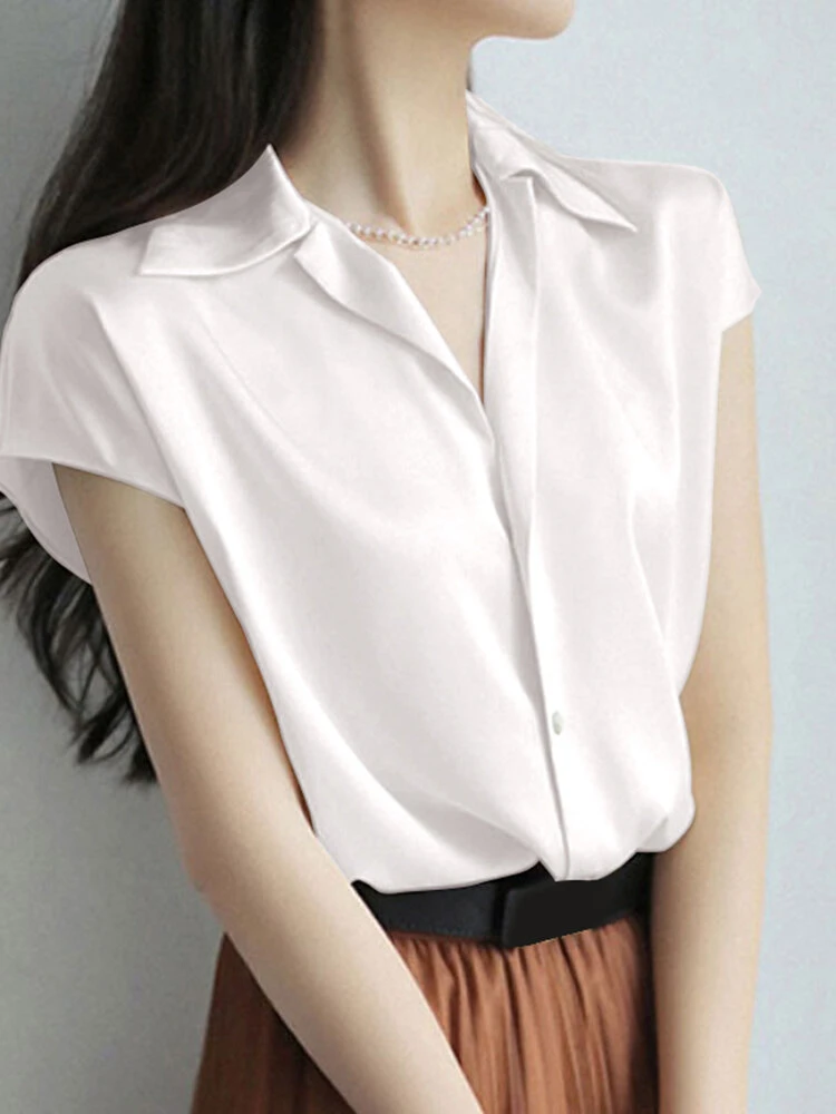 Solid Satin Button Lapel Short Sleeve Women Shirt