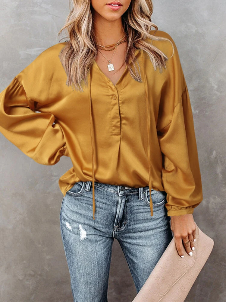 Color: Yellow, Black, Gray Material: Polyester Pattern: Plain Occasion: Everyday Style: Casual Sleeves Length: Long Sleeve Collar: V-neck Season: Autumn, Spring Design Element: Button Front Package Included:1*Blouse